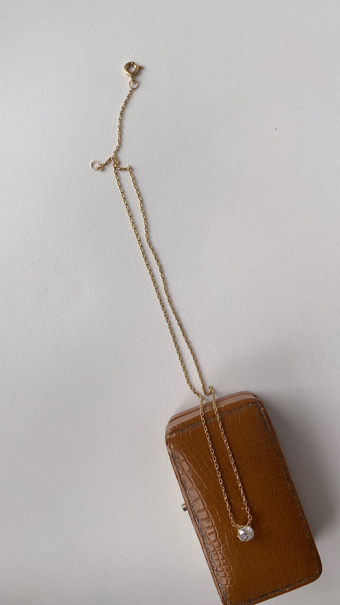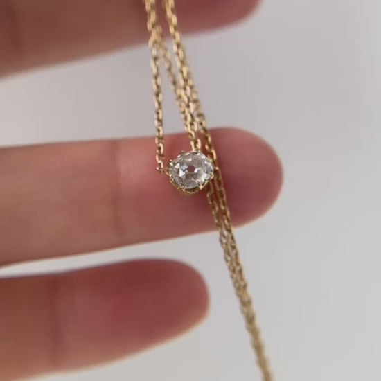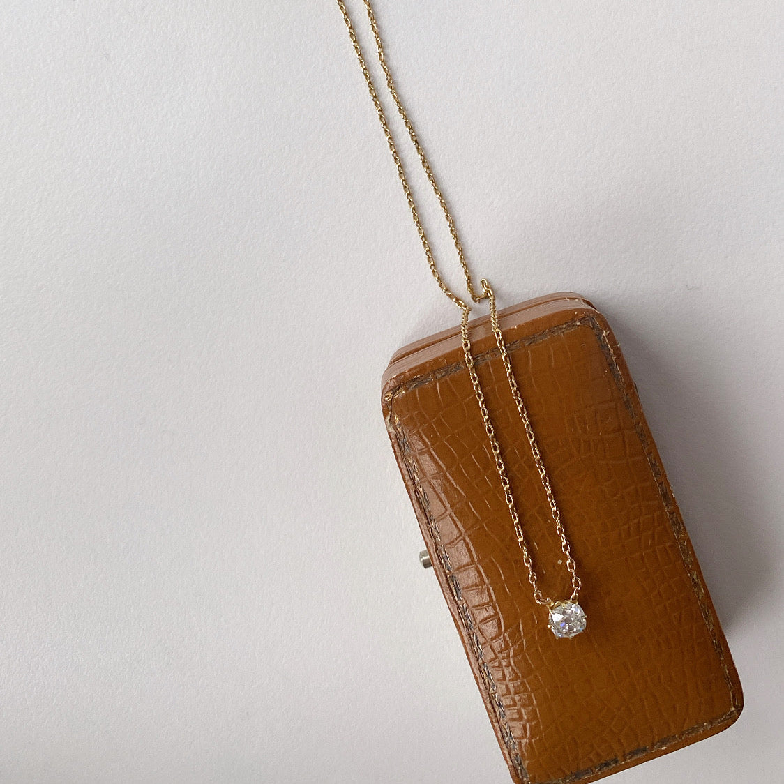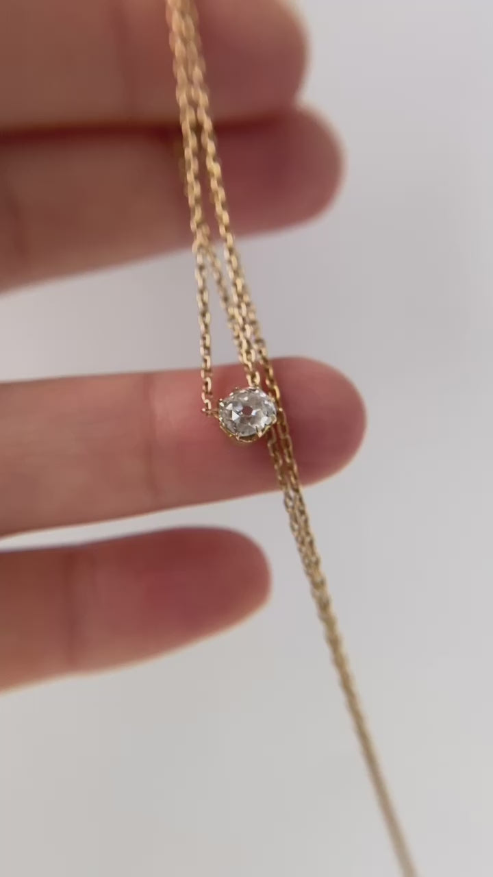 Featuring a bright and lovely .50ct old mine cut diamond, with its pillowy shape, chunky and puffy, suspended on a fine 18ct yellow gold chain. The diamond is in its original setting and was part of an antique brooch, now expertly converted. What’s not to love? Classic and timeless, this is one for a bit of everyday magic! Absolutely gorgeous and noticeable on its own or as part of your neckmess!