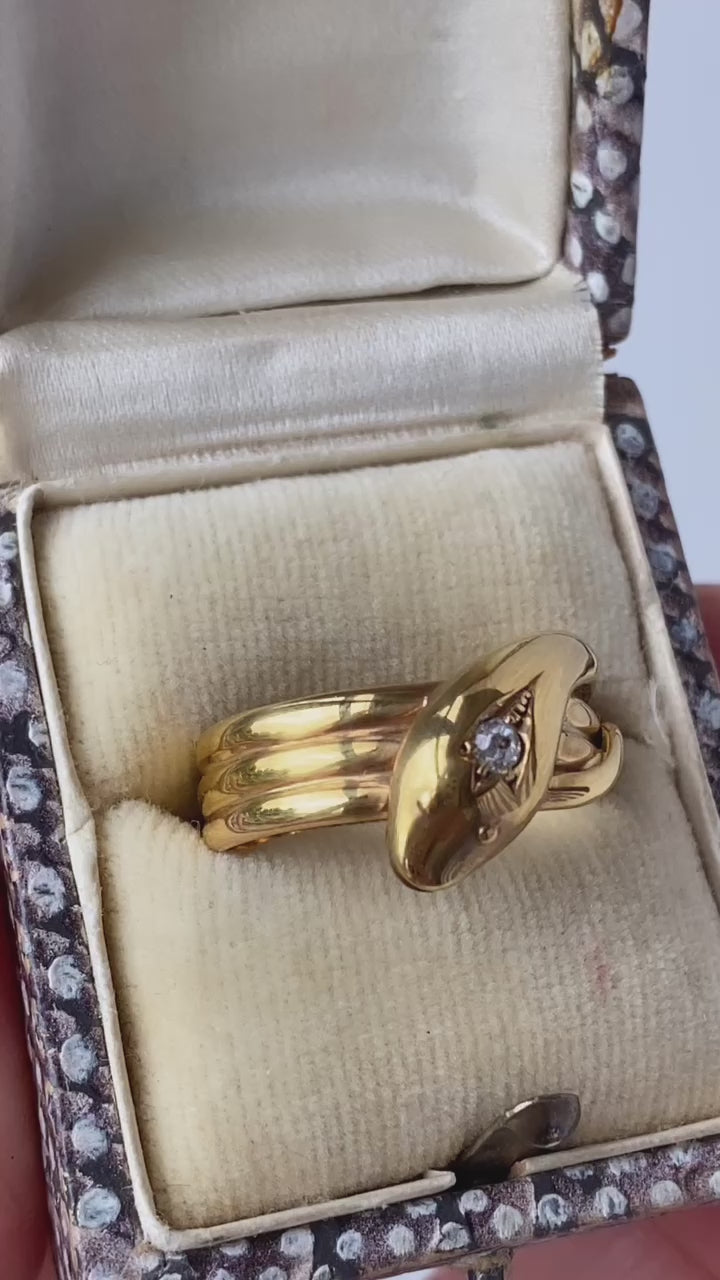 A beautiful snake ring with a bright sparkling old cut diamond, would make a wonderful addition to your collection.