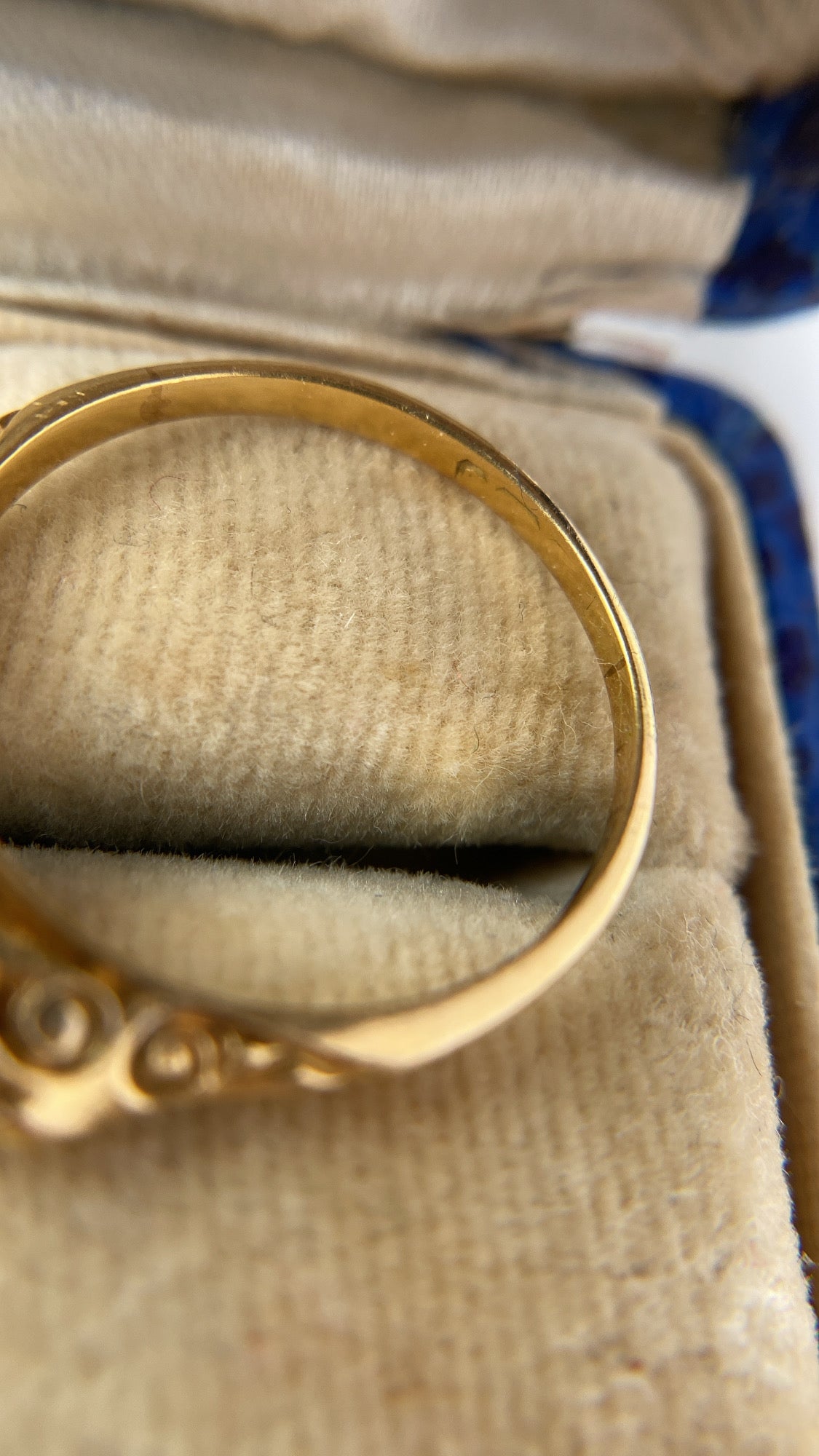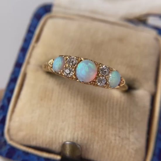 The centre opal cabochon measures 4.3 x 3.5mm and the two opals on the sides measure around 2.9 x 2.3mm. The four old cut diamonds twinkle beautifully, have lovely colour and clarity and weigh a total of 0.12ct. They have lovely little puffy crowns under magnification and are extremely sparkly! The face of the ring measures 15mm wide, beautiful ornate scrolling along the gallery; the shank is sturdy with a beautiful warm butter gold patina to it. In lovely antique condition, the stones are clean and free of bastions, some historical evidence of resizing is there, but not noticeable.