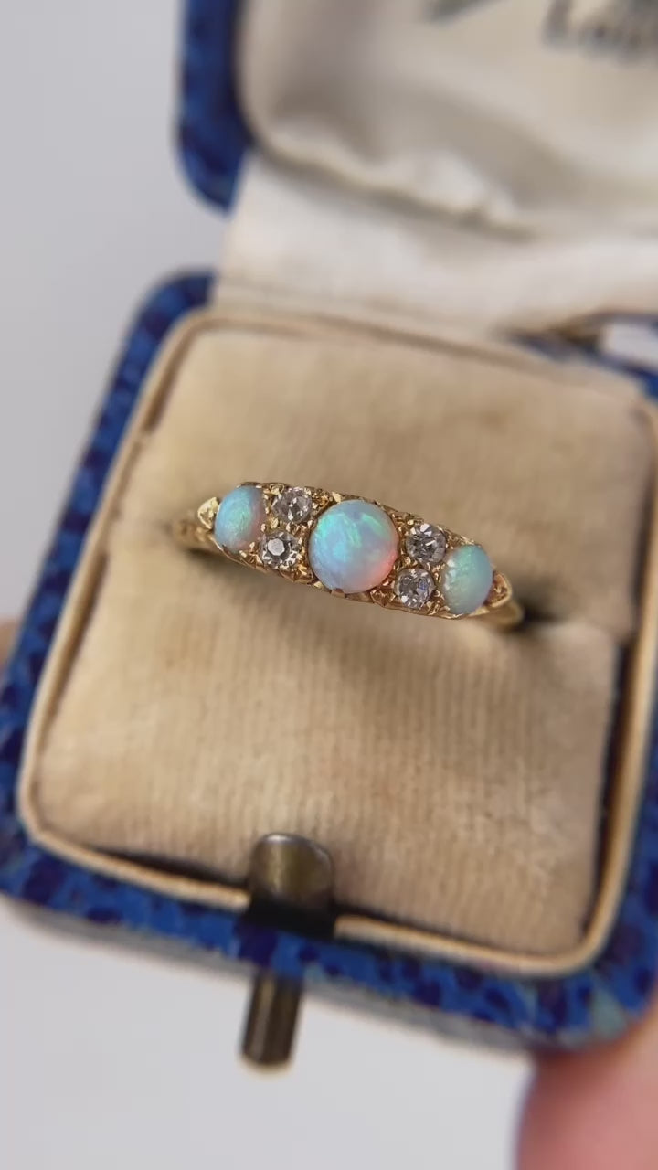 This is a superb antique three stone opal and old cut diamond ring, set in 18ct gold and dating from the Victorian era.