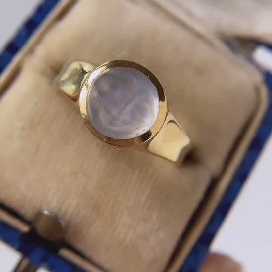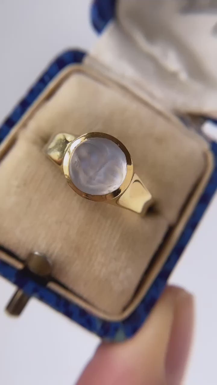 Set in 18ct rich yellow gold, this beautifully carved man in the moon is simply wonderful. The moonstone is set in a signet style and the stone has beautiful adularescence as it catches the light and changes with movement. A cheeky, smiley little chap that is full of character! Bezel set, the head measures 7.9mm and sits lovely and low on the finger, making it extremely wearable and tactile.