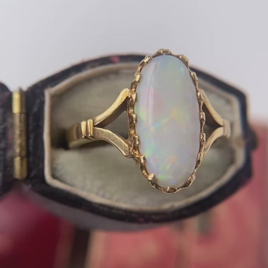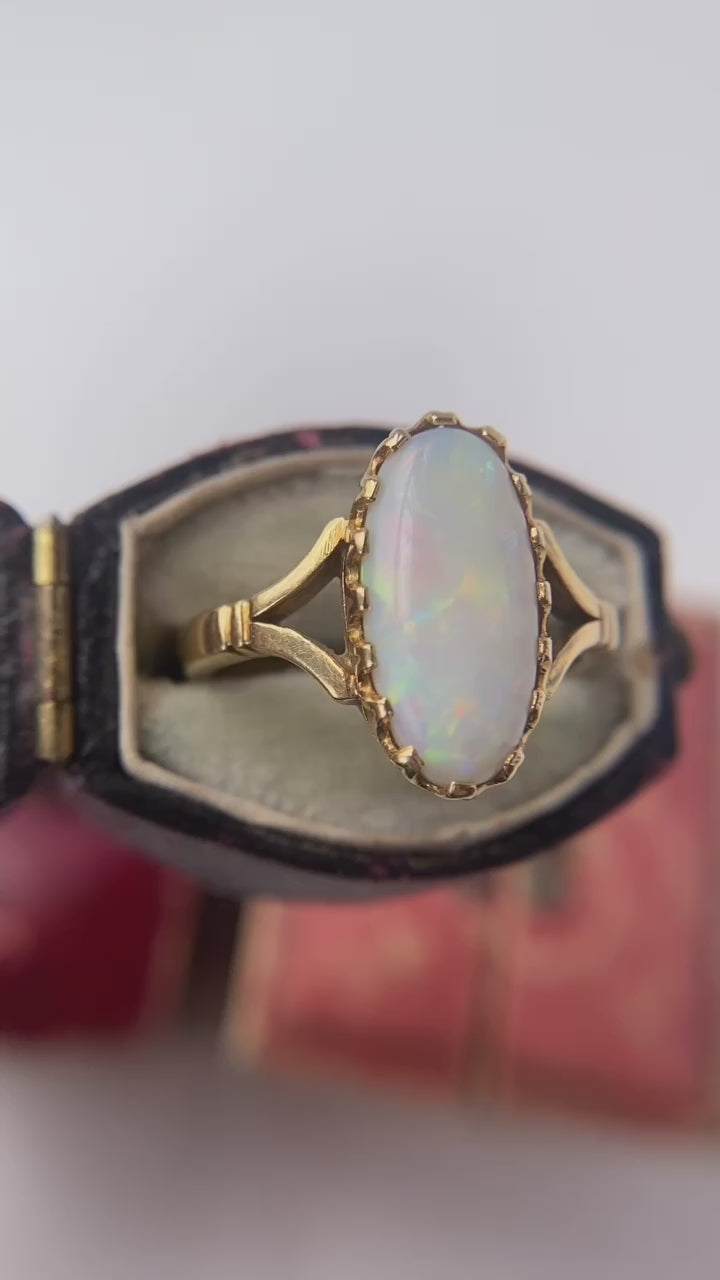 Featuring a long oval opal, that exhibits colourful patches and wonderful plays of orange, red and green as it moves around the light, it is great size measuring 14.9 x 7.6mm. Completely in love with the way this has been set! It sits low on the finger within a beautiful crown setting secured by a lovely “basket” of prongs. With split shoulders, the shank is solid and of good thickness, no evidence of resize that I can see.