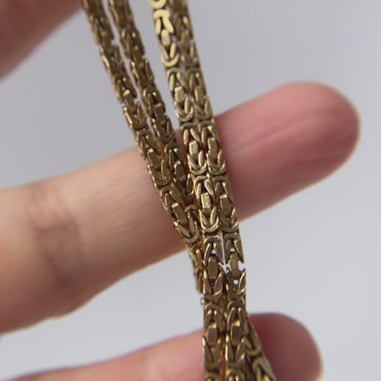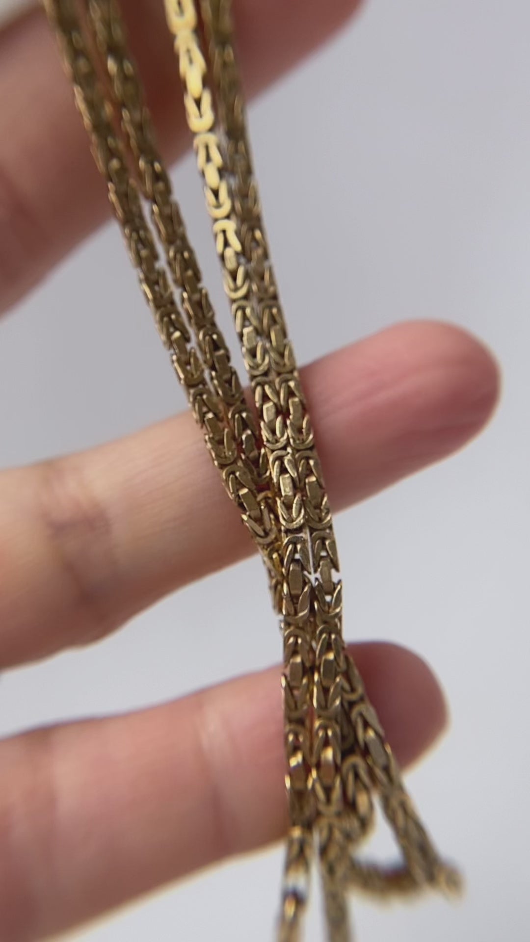 Vintage from the 1990s, this gorgeous chain with its square, boxy multi fancy “byzantine” link, is crafted in solid 9ct gold, weighs 13.4g and is 20” long. A great length and design with beautiful gold patina, it shines and sits perfectly on the neck, slinky and golden! Great for everyday, you can easily either rock it solo or as part of your neckmess. Definitely one to put on and never take off! Secure with a lobster clasp.