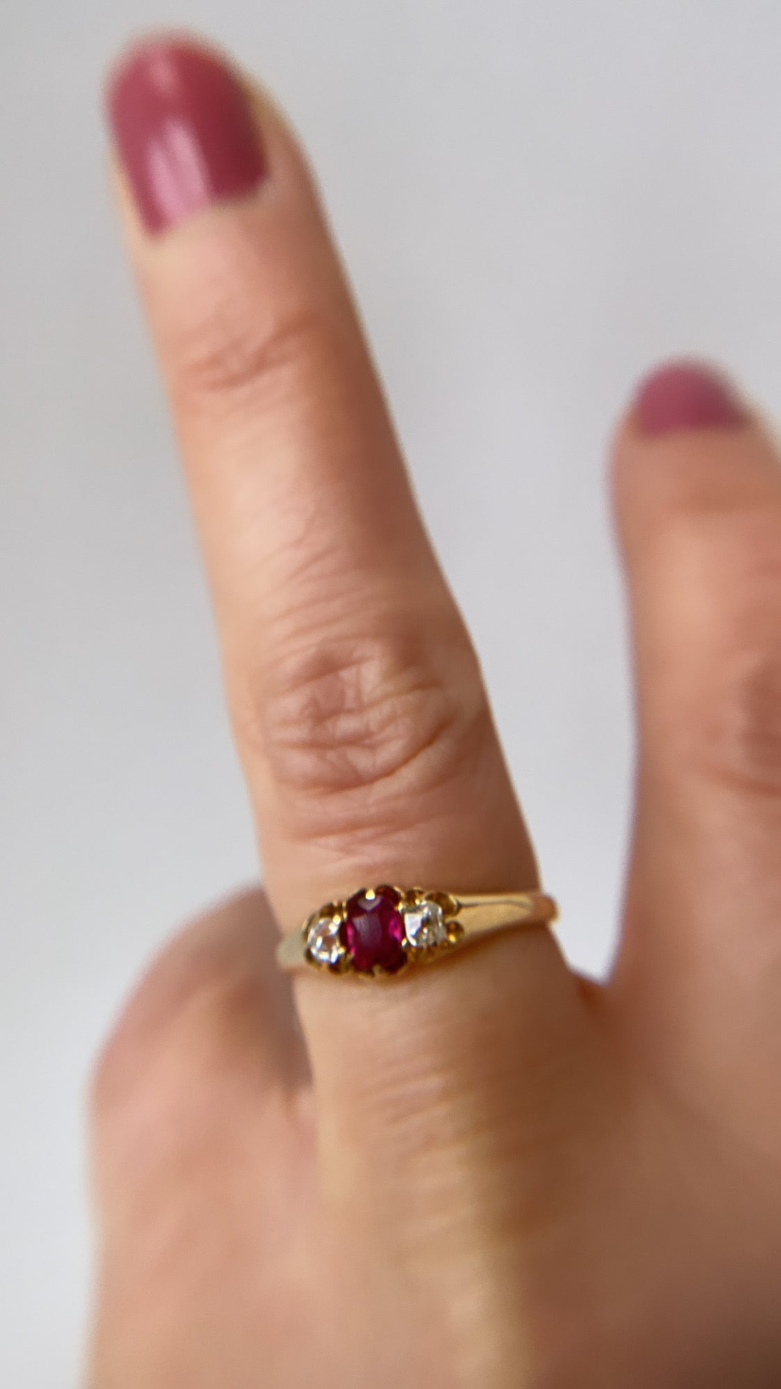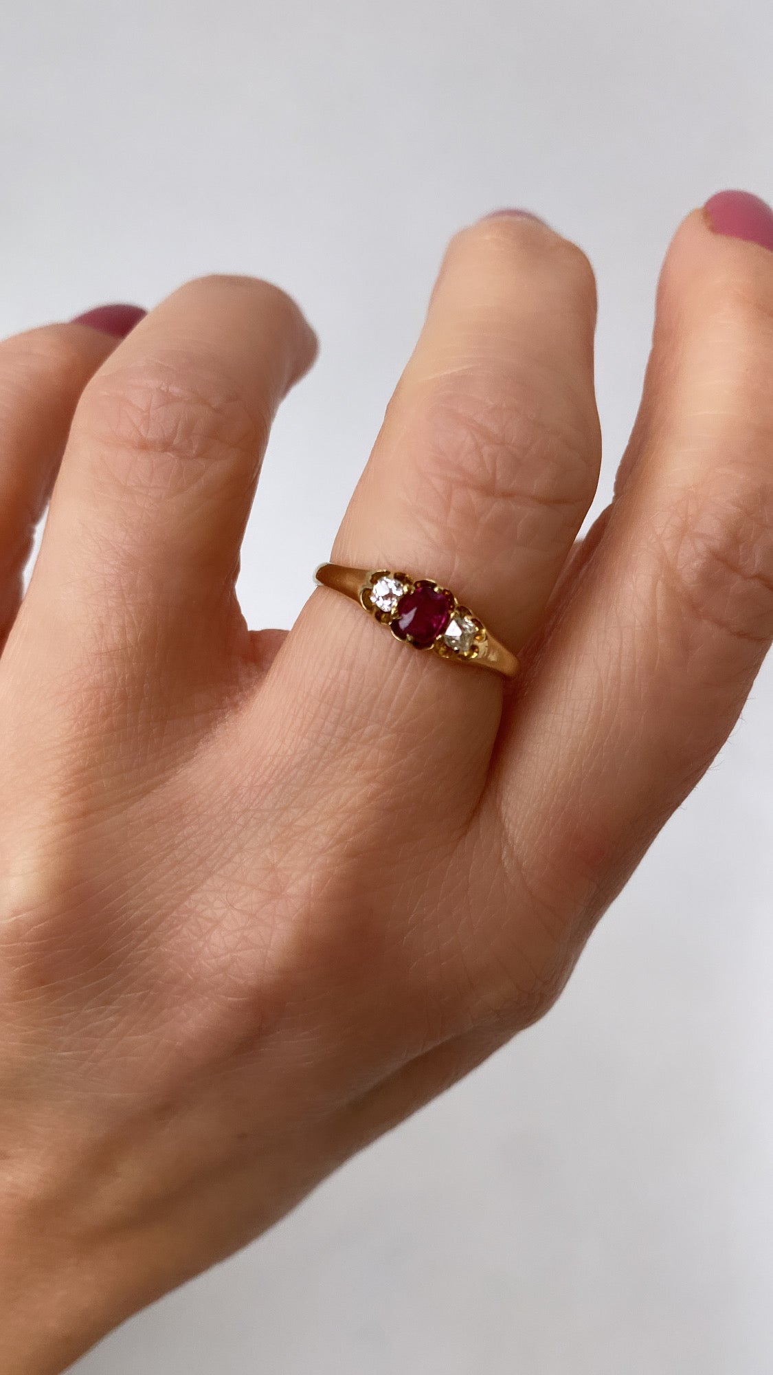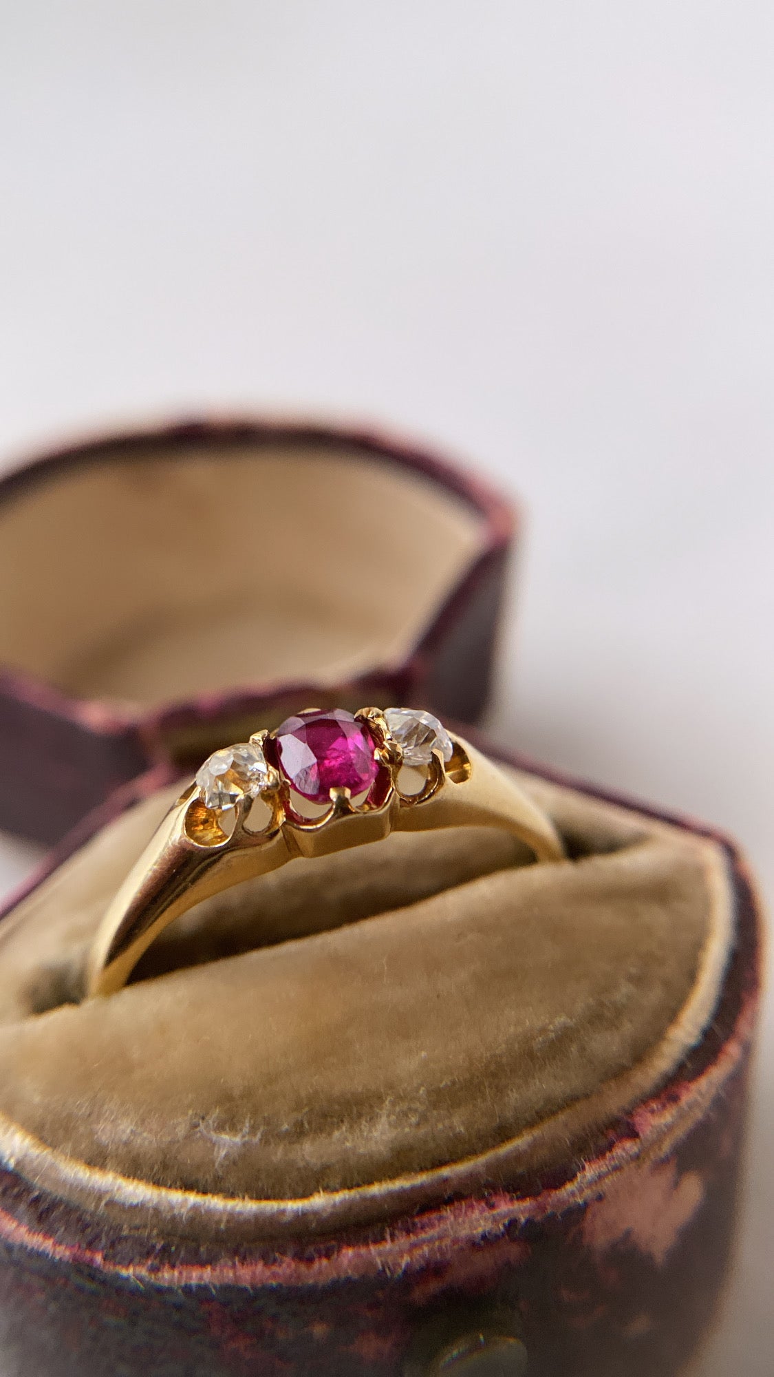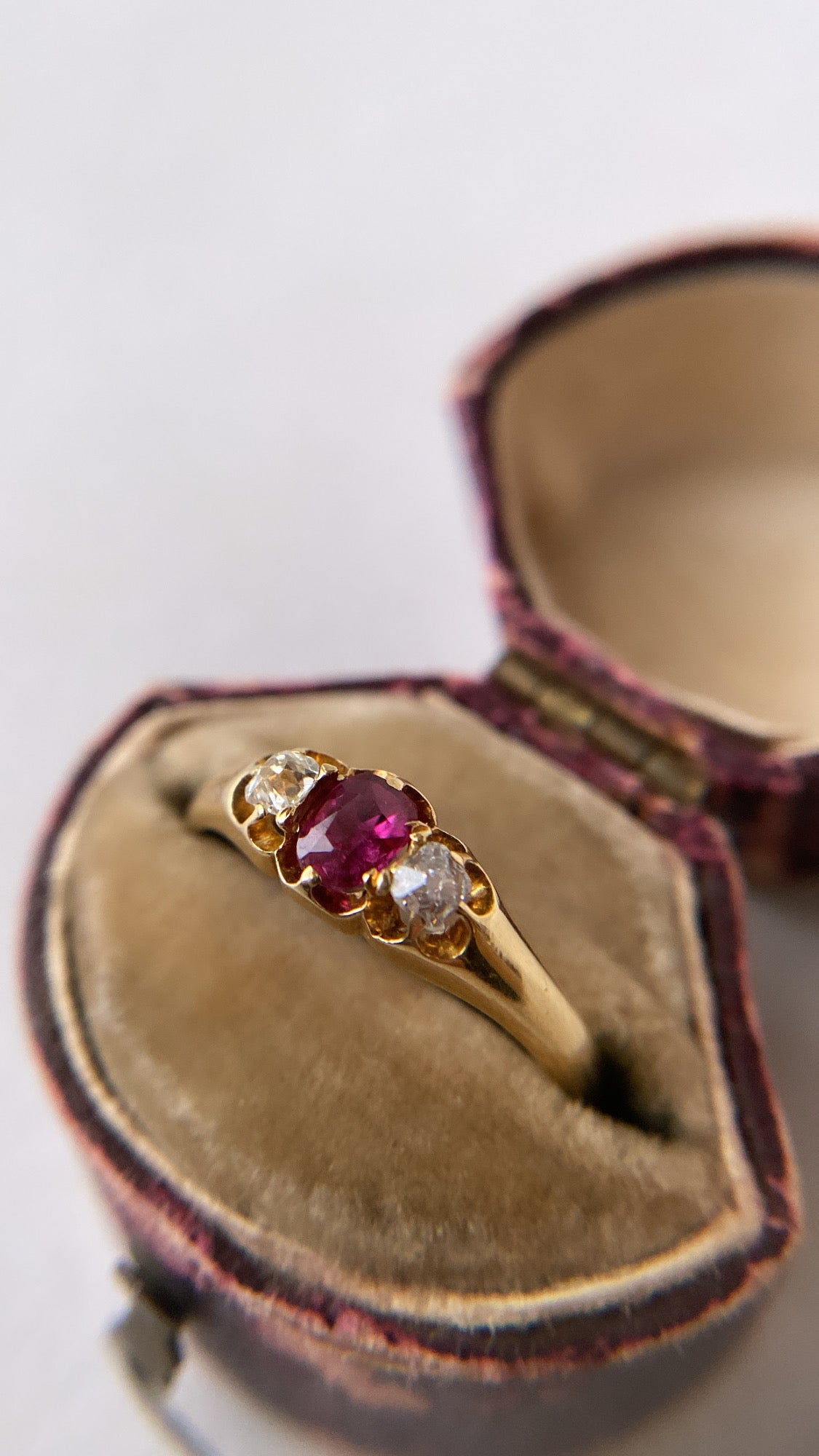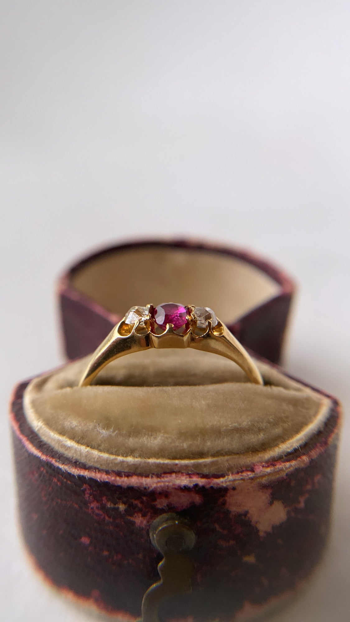 A beautiful trilogy featuring a natural ruby and two stunning peruzzi cut diamonds, set in 18ct yellow gold and dating from the Victorian era.