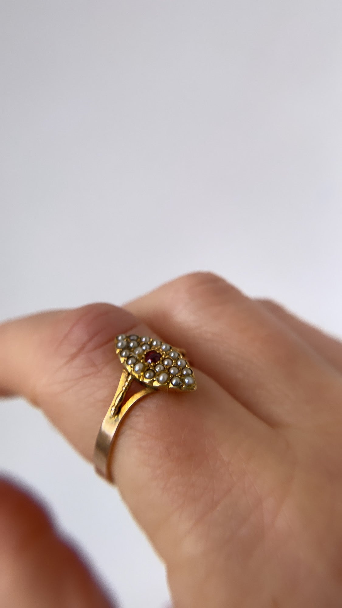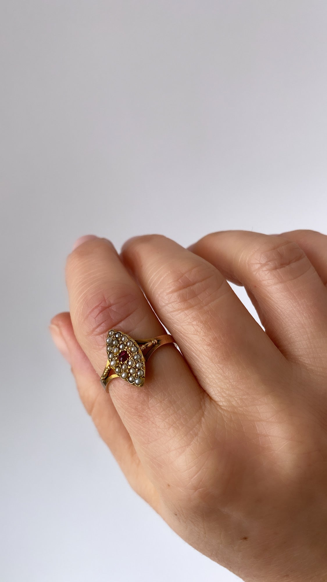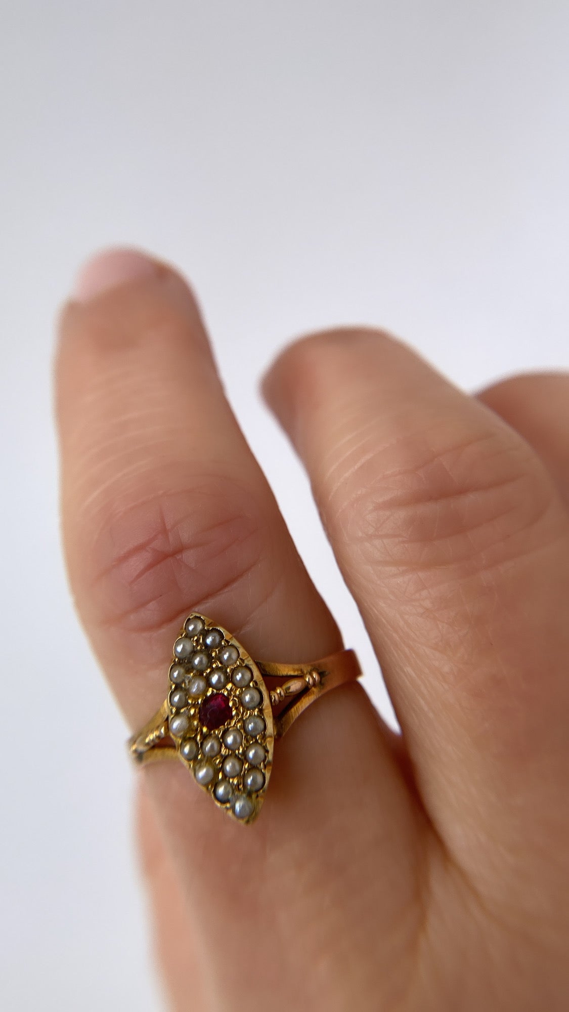 A beautiful antique Victorian navette ring featuring a natural ruby surrounded by beautiful seed pearls.