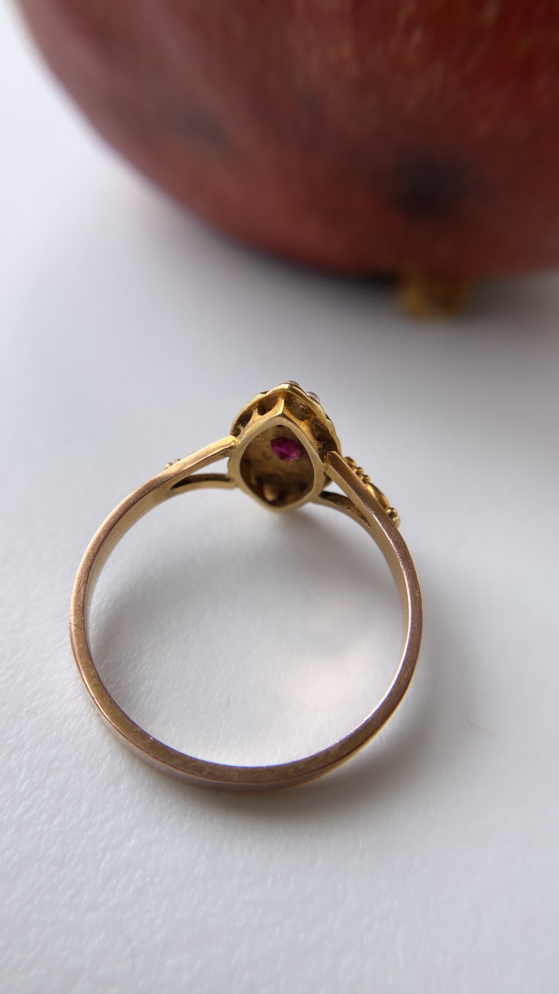 The ruby takes centre stage - a pigeon red pop of colour that has such a presence for its size! It is bright, strong and powerful! Surrounding the ruby are 21 creamy grey, seed pearls, all original, in a beautiful navette form. What I particularly like is the sweet gold detailing in between each seed pearl and the patina is so wonderful, an old matt yellow gold. With beautiful detailed split shoulders leading to a solid shank (which I think is a historical replacement). The setting measures 14.6 x 7.6mm and the shank is 2.3mm all round, no thinning.
