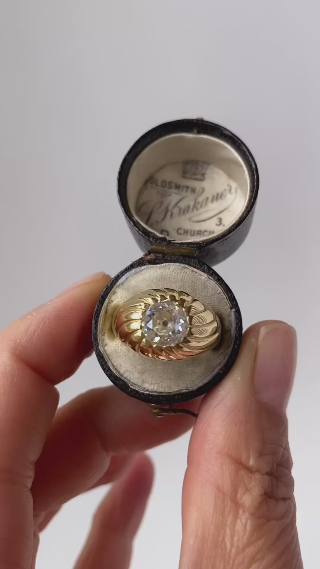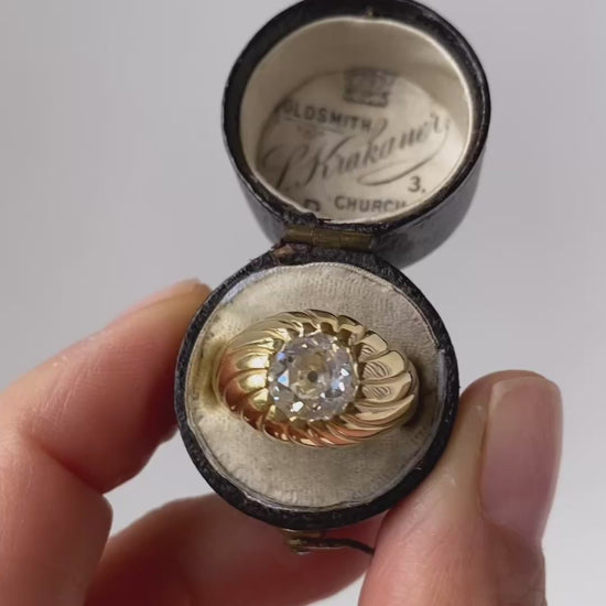 This absolute bomb of a ring is crafted in solid 18ct yellow gold and features a magnificent old cut diamond taking centre stage. Weighing around 1.60ct (J/SI), it is full of old charm and character, chunky with a high crown and a clearly visible culet, a beautiful stone with incredible presence and facets that make it sparkle like crazy. It is securely bezel set in lush, liquid solid gold with a swirl pattern that goes all the way round the band. The shank is solid and weighty, feels super comfortable when worn like a weighty blanket. The diamond measures 7-7.2mm and the width at the top of the band is 11.7mm. Made in the 1960s, Italian in origin, this beautiful solidly made ring would make the most unique engagement ring, right hand ring or pinky.