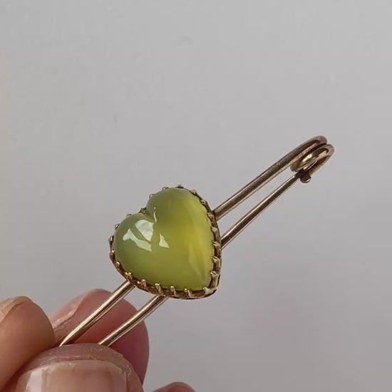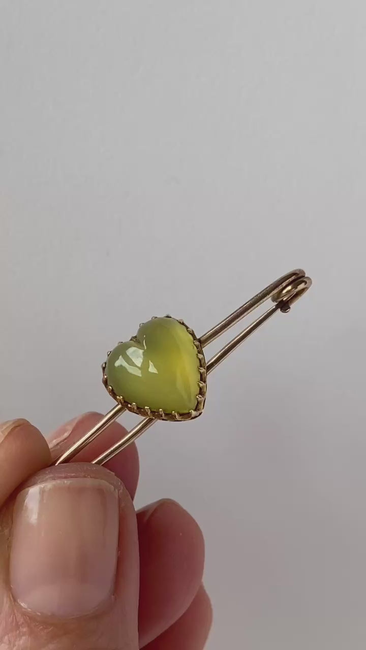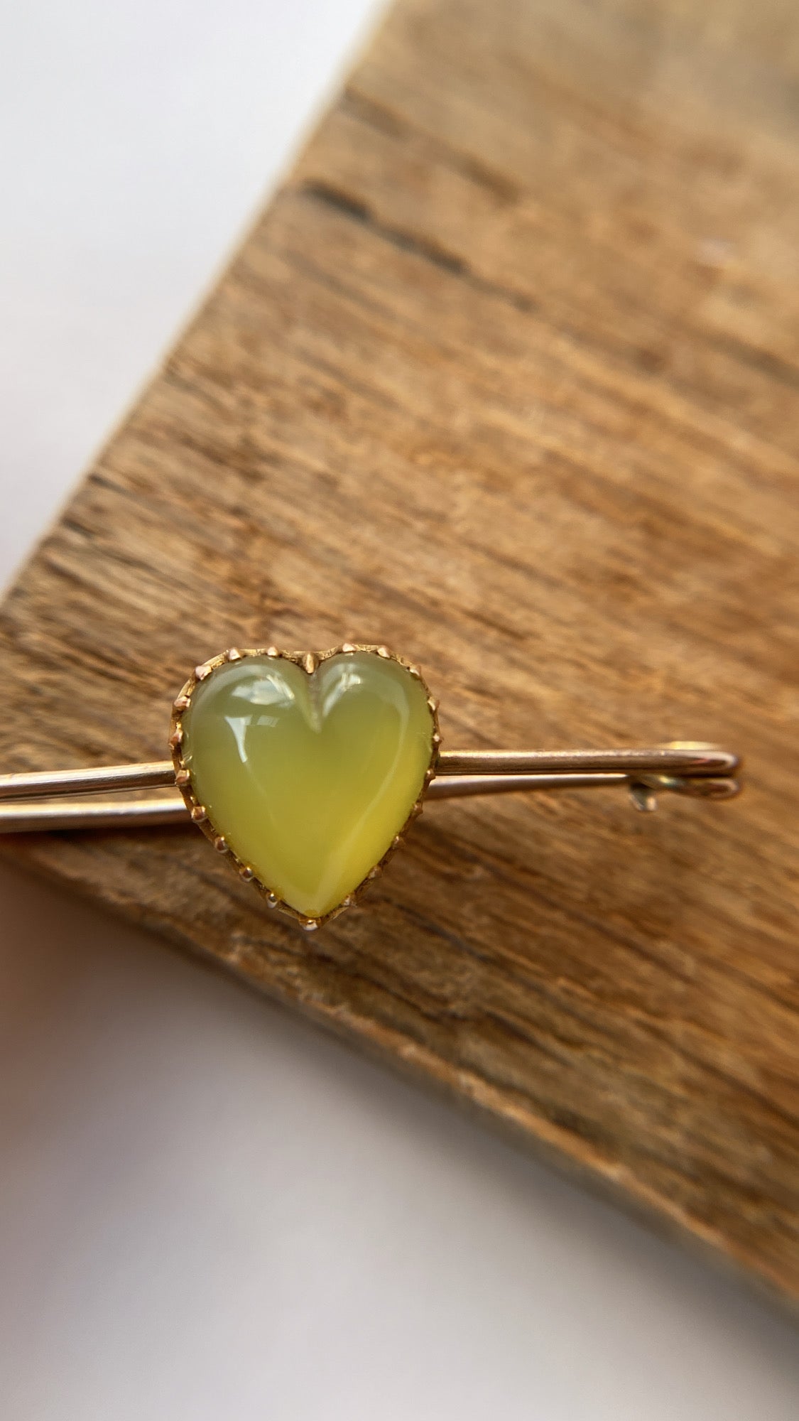 A very pretty heart shaped chalcedony gemstone pin brooch with 9ct gold setting and pin and dating from around the 1900s.