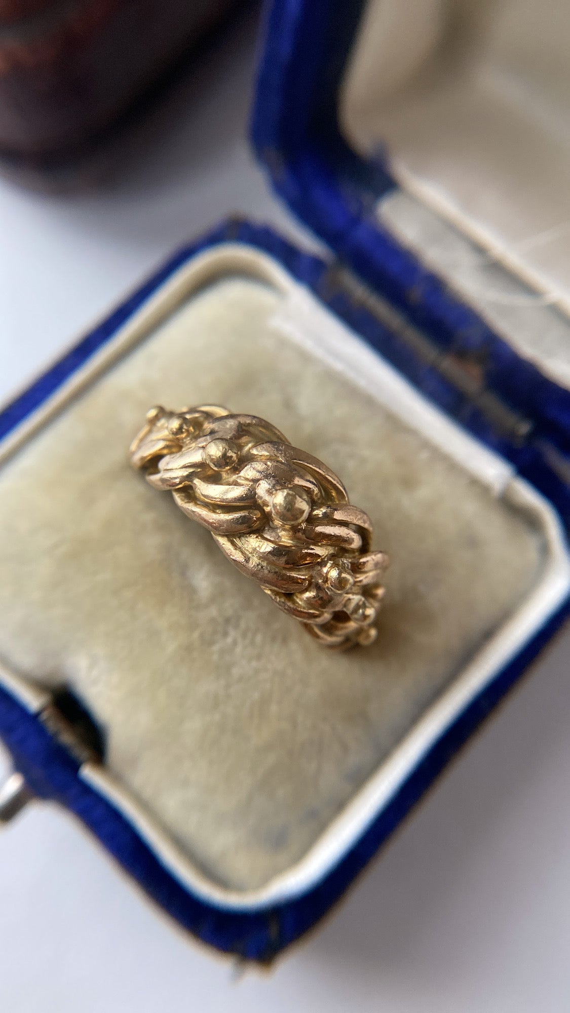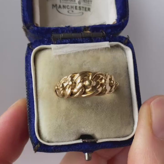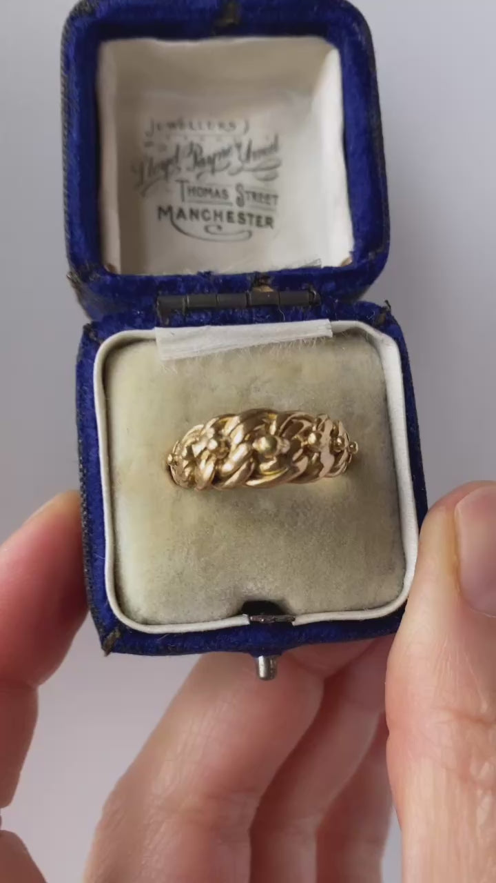 A lovely, hefty ring, featuring beautiful scrolling knots and beading details. With lovely butter gold patina, the ring is in beautiful condition, with clear chunky beads and entwined rope detailing. The head of the band measures 7mm wide and 19mm across.