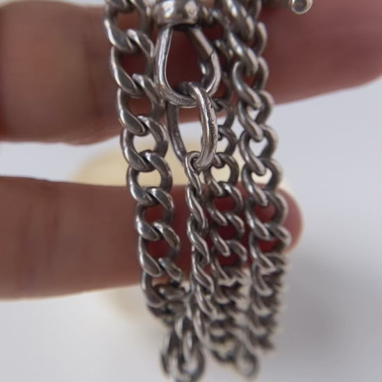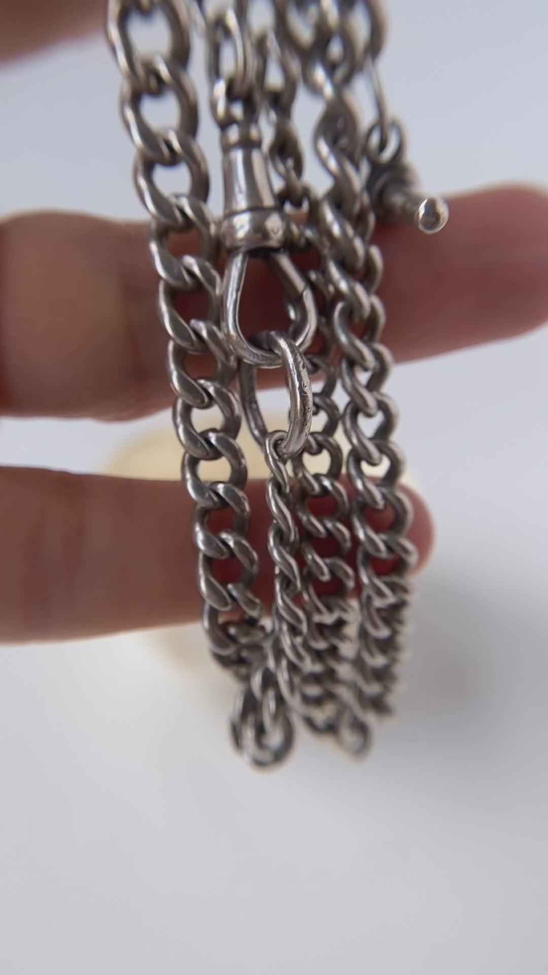 A fabulous chunky curb link double Albert chain in old weighty sterling silver, made up from two graduated chains soldered together with a movable antique silver T-bar, dog clip and large bolt ring. Fully functioning, the dog clip is hallmarked for sterling silver, though marks are faded, with makers mark ‘H A & S’. T-bar also fully hallmarked for sterling silver, date letter ‘r’ , circa 1916, makers mark also ‘H A & S’.