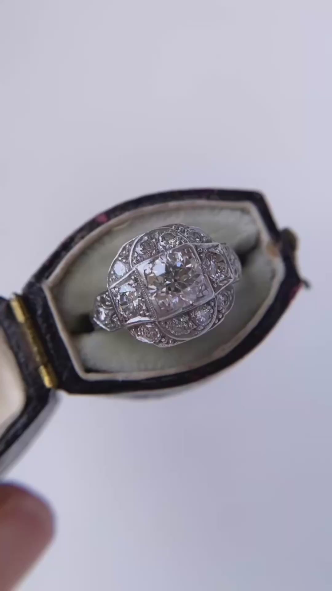 Featuring a rather lovely geometric design, typical of period, this original 1920s ring is set with a very beautiful, chunky round old cut diamond (estimated carat weight 0.66 carat, very clean VS clarity, super white H/I colour) to the centre, within a cluster of similar quality bright, super sparkly diamonds tapering down to beautifully carved white gold shoulders and a slightly tapering shank. A nice spready setting, it measures 17 x 12mm and sits beautifully low on the finger. A dream indeed and a lovely example of Art Deco craftsmanship and design.