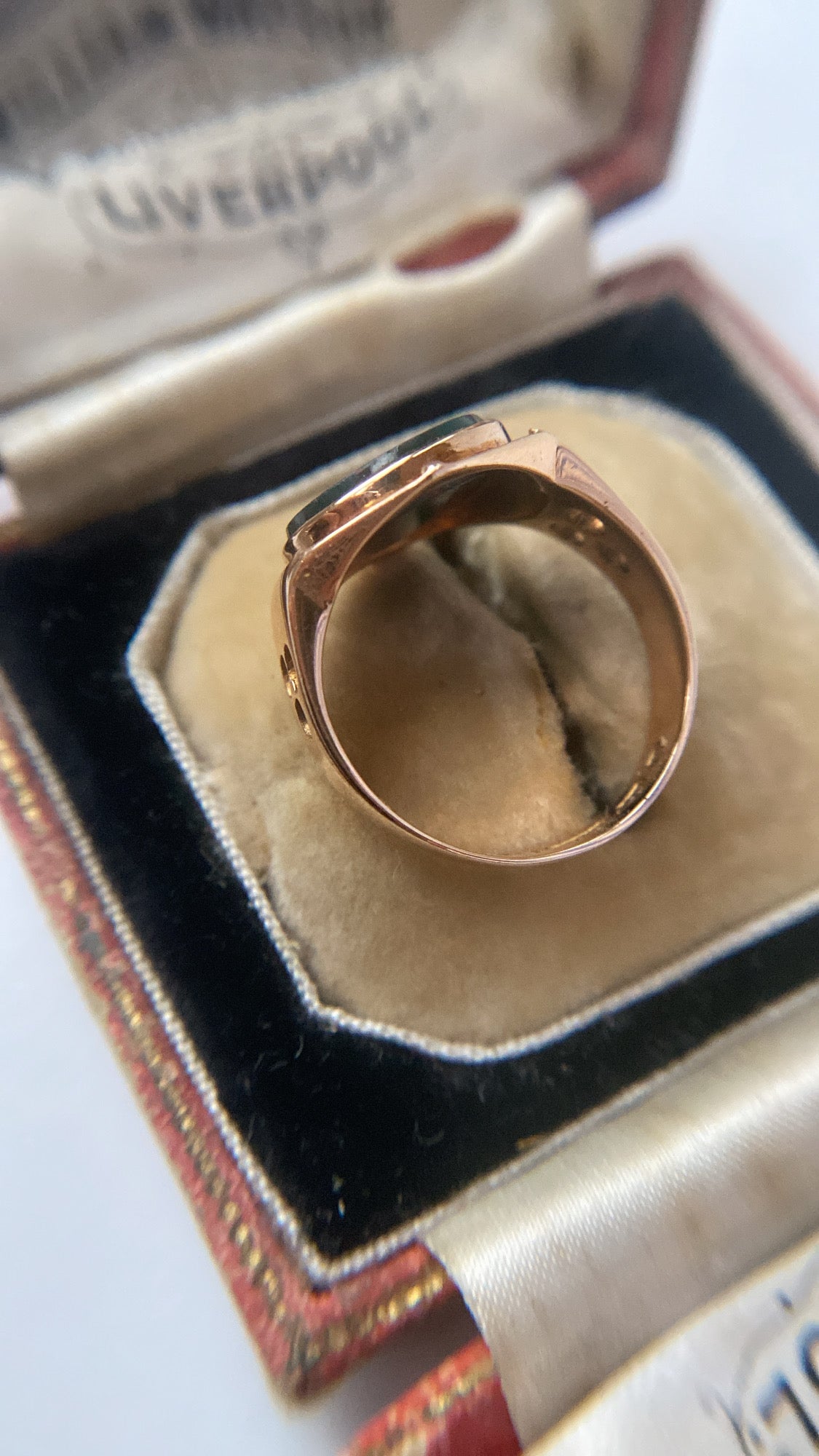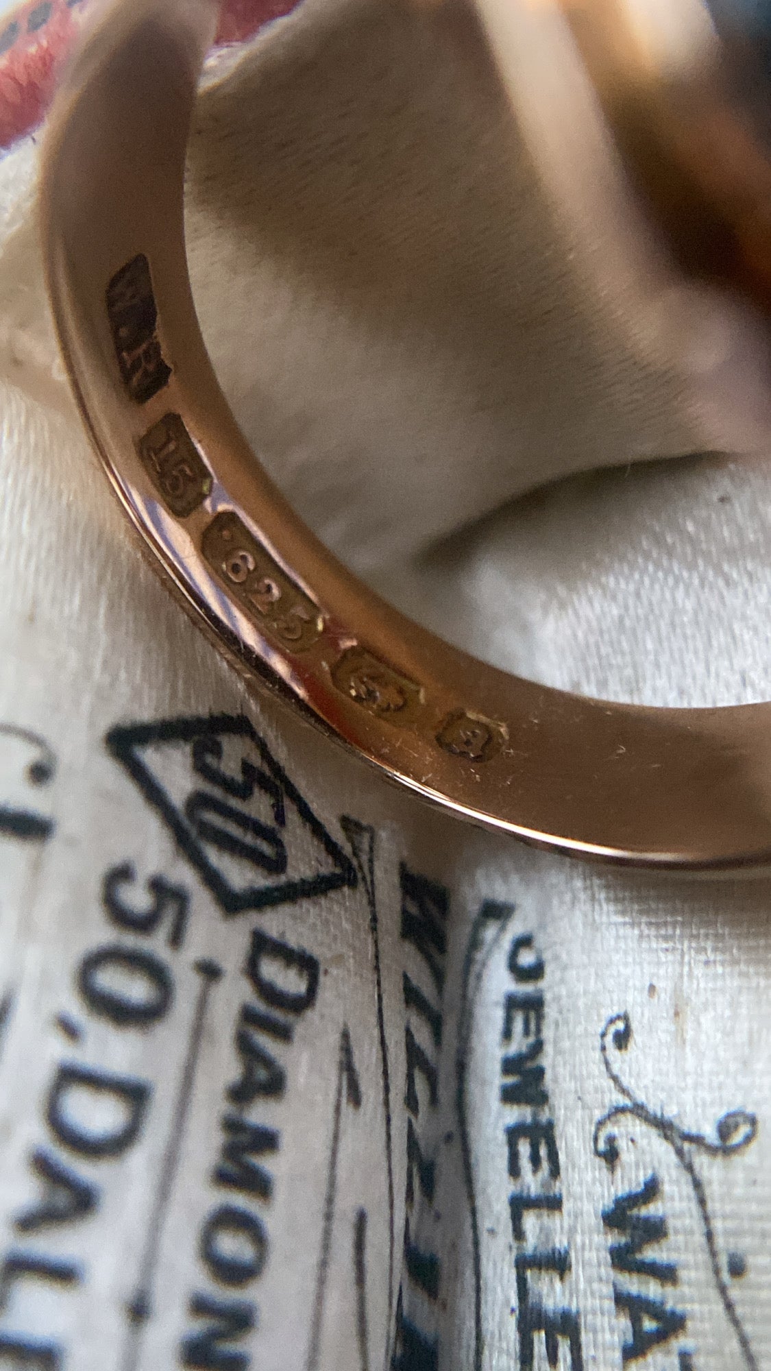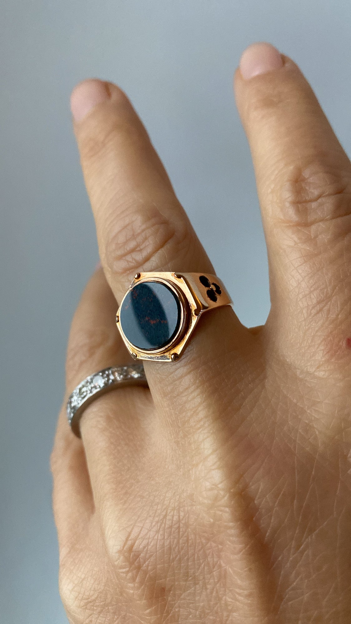 Crafted in 15ct rose gold, with crisp hallmarks, the ring dates to 1875 and is just amazing…Featuring a perfectly round bloodstone with clear visible flecks of red, it is securely bezel set in a unique hexagonal gold setting, that really brings out its shape. The bloodstone is 11mm in diameter and the setting measures 16.3 x 15.8mm. Dotted with little beads of gold on each corner, the lush liquid gold shank has a further three round circles/pattern on each shoulder (reminds me of a trefoil almost) and a good solid band that measures 3.7mm at the back. In very good antique condition, the bloodstone has no damage to it, no scratches and the rose gold is a lovely warm hue and patina to it.