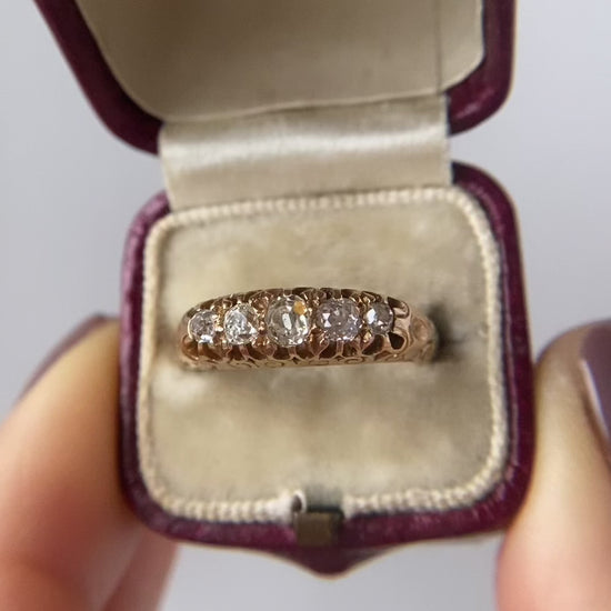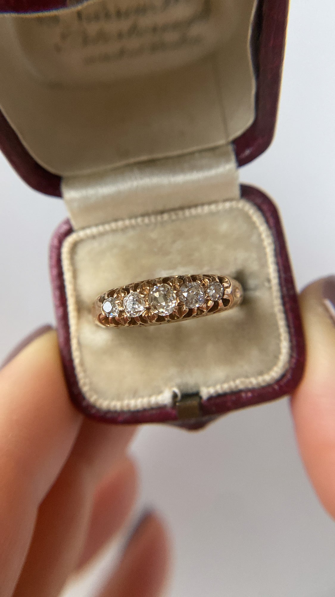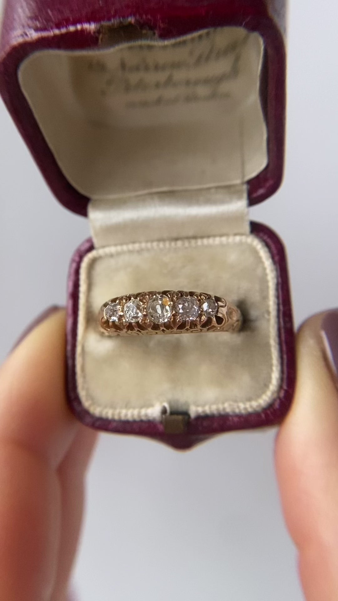 Set with five chunky old cut diamonds, bright and full of character, with high chunky domes, they total approximately .55ct with the centre diamond around 3.7mm, the side ones 2.2mm and the two on each end at about 1.6mm. The diamonds are claw set and the setting measures 14.8mm across and rises 4.3mm, making it great for stacking with other gold bands. With lovely engraved details throughout and with crisp hallmarks, the band is good and solid. In lovely antique condition with minimal signs of natural wear commensurate with age and use.