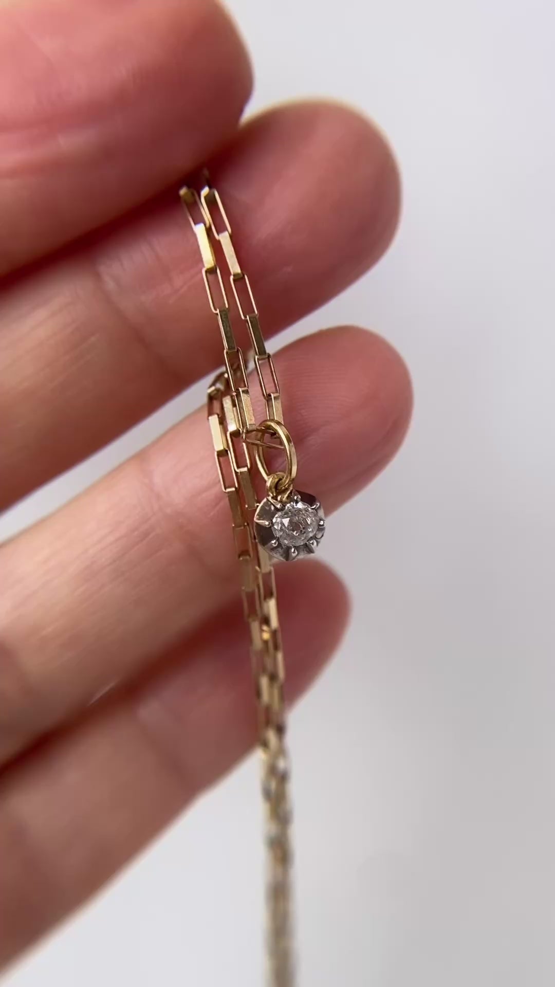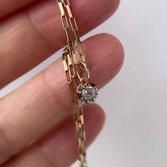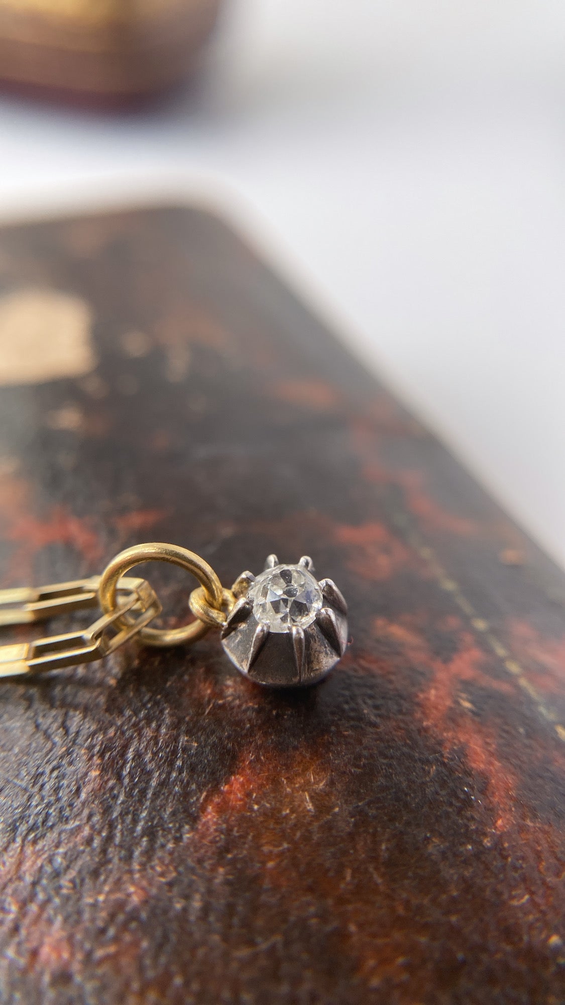A chunky and wonky, bright and characterful old cut diamond in a silver collet setting with an 18ct gold jump ring. The diamond is approximately .20ct and measures 2.6 x 3.4mm, has a lovely cushion shape with a high crown. A bright and white stone, this would be perfect for every day, wear as a standalone or stacked with other charms. The charm measures 5.5mm in diameter and 11mm including the jump ring.