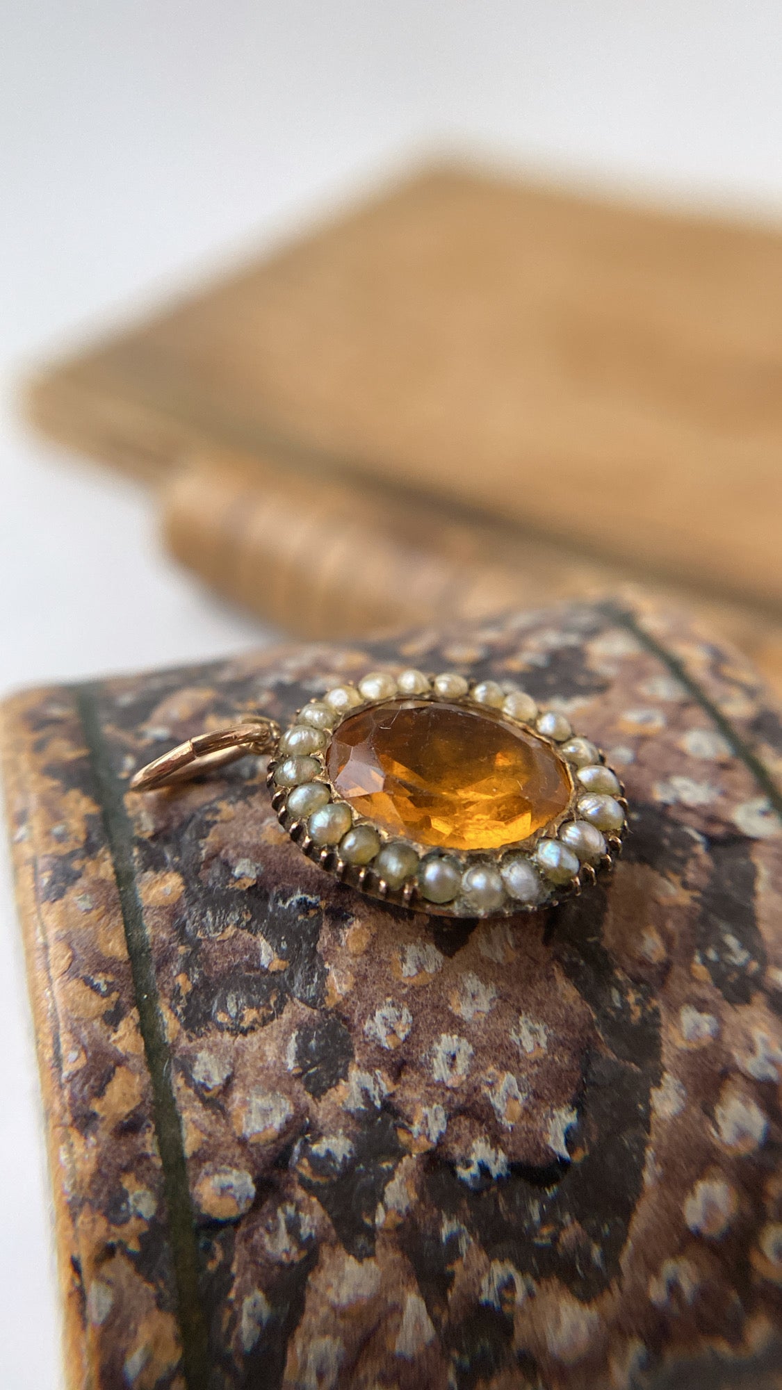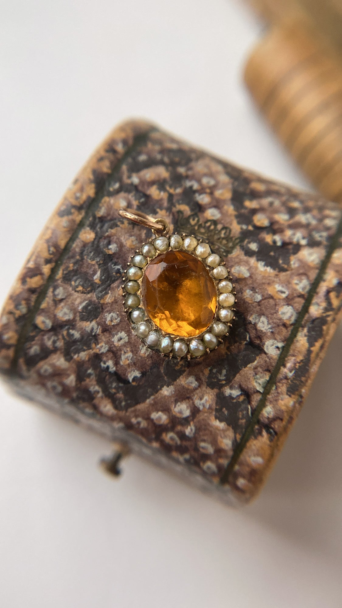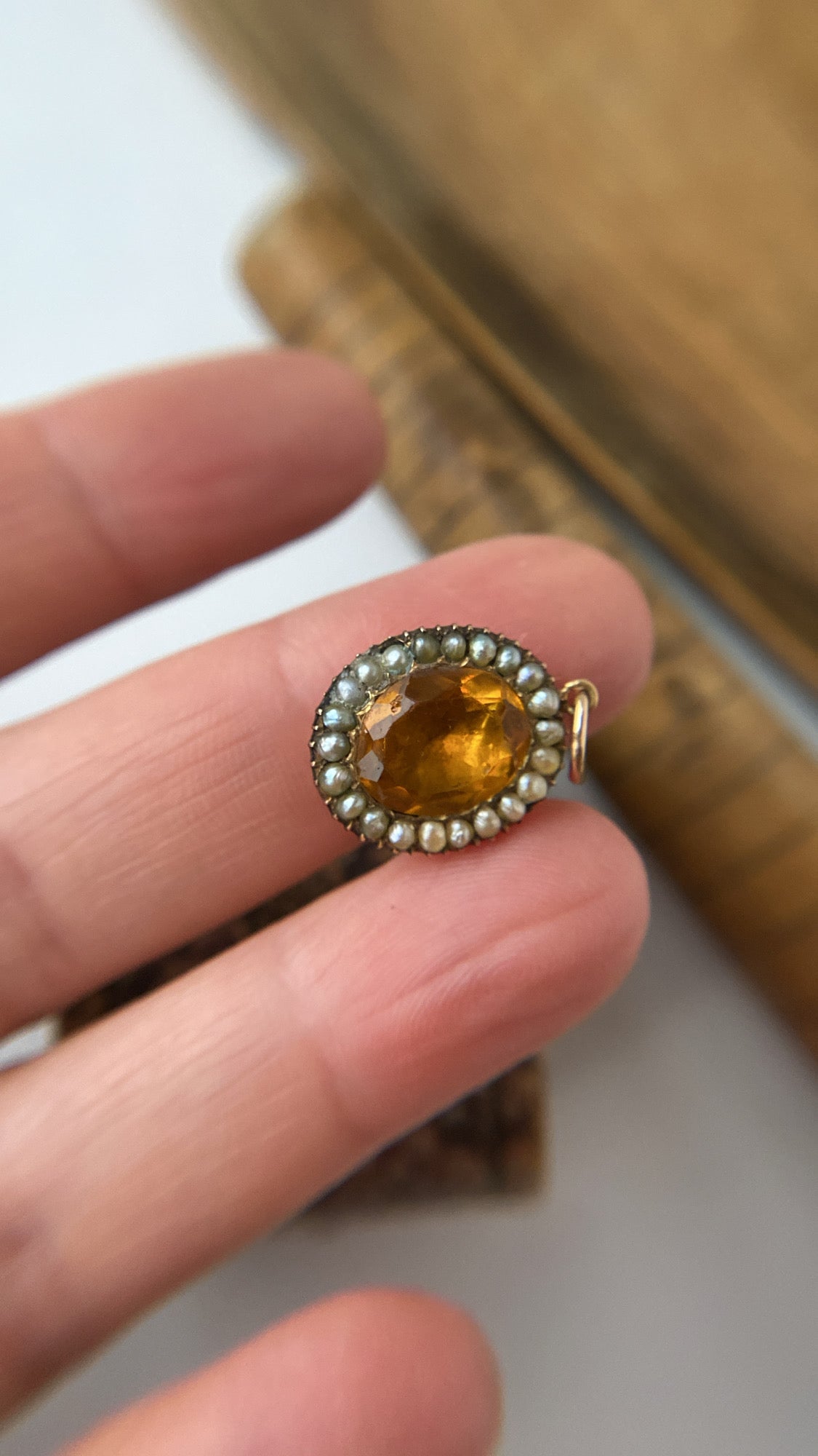 The paste is a deep, glowing whiskey yellow, a lovely pop of colour, that is surrounded by a halo of creamy grey seed pearls, all original to the setting. In good antique condition, with some expected age related wear, the pendant is a very good size measures 16.2 x 12.7mm.