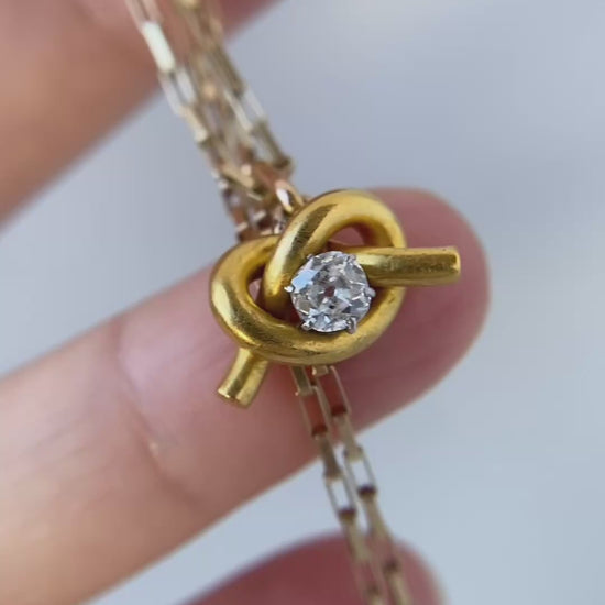 Dating from around 1900, this beautiful pendant features a bright old mine cut diamond of approximately .25ct. Set in lush, LUSH 18ct buttery gold, the crisp white diamond really stands out against the gold. The pretzel shaped love knot measures 11.4 x 8.4mm and is fitted with a slightly elongated bail that would fit through most chains.