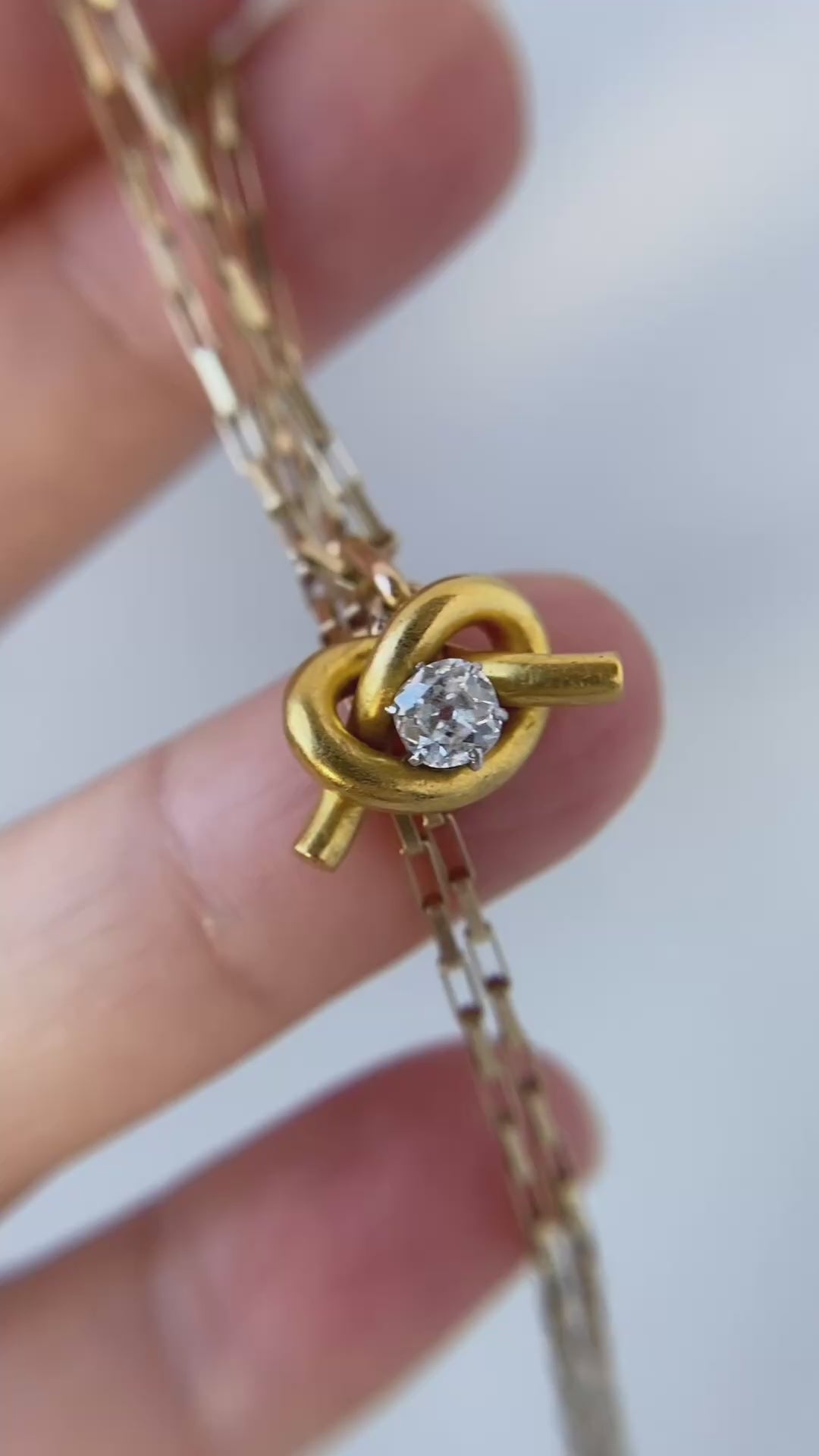 A stunning pin to pendant conversion featuring a beautiful antique diamond love knot.