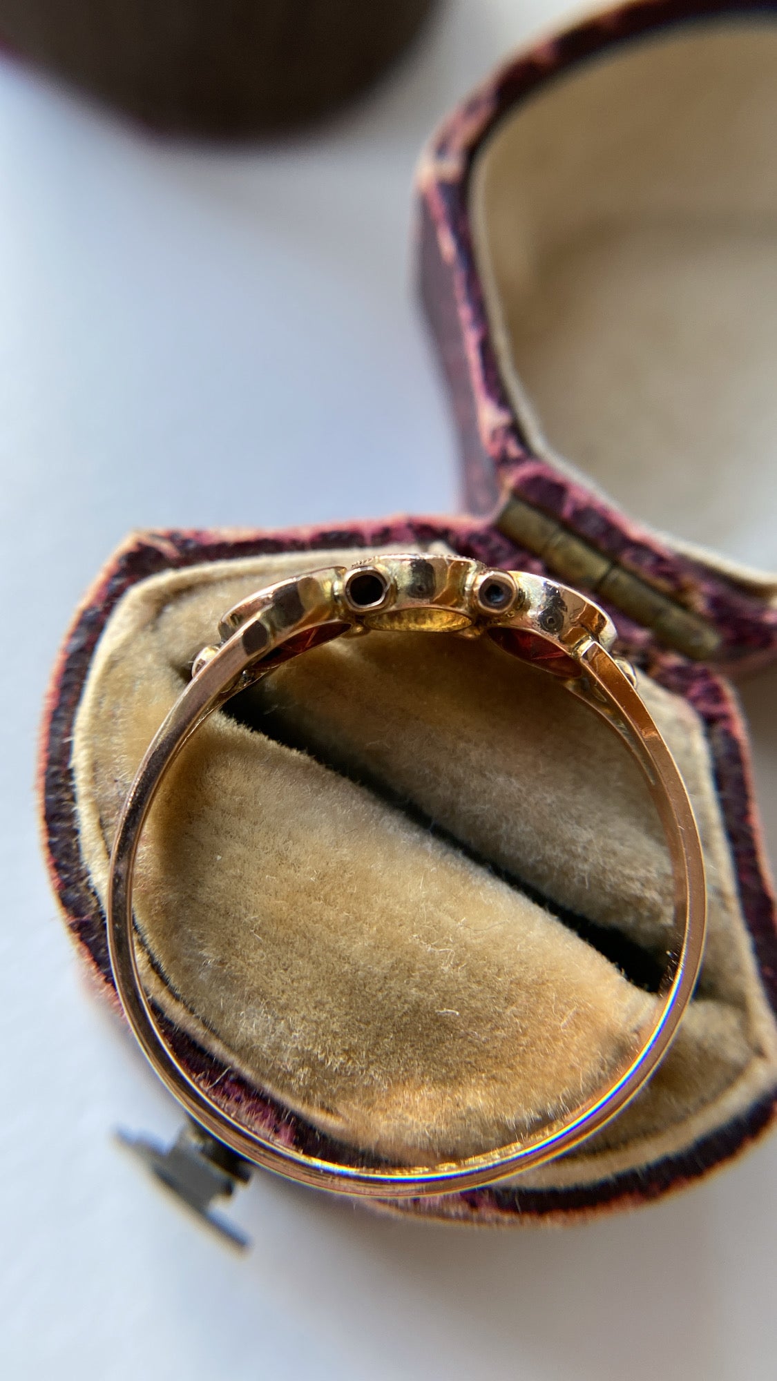 The ring is in beautiful condition, the stones crisp and bright, with the opal showing all its magical rainbow colours, lots of flashes of orange, blue and green. It really is a little firecracker. Either side are two beautiful deep red, whiskey coloured garnets with six little gold balls interspersed between. The setting measures 15.2mm across and the stones are securely bezel set in their milgrain settings, leading to a plain gold shank, slightly old rosy gold in colour. Sits lovely and low on the finger, each stone is around 4.7mm in diameter.