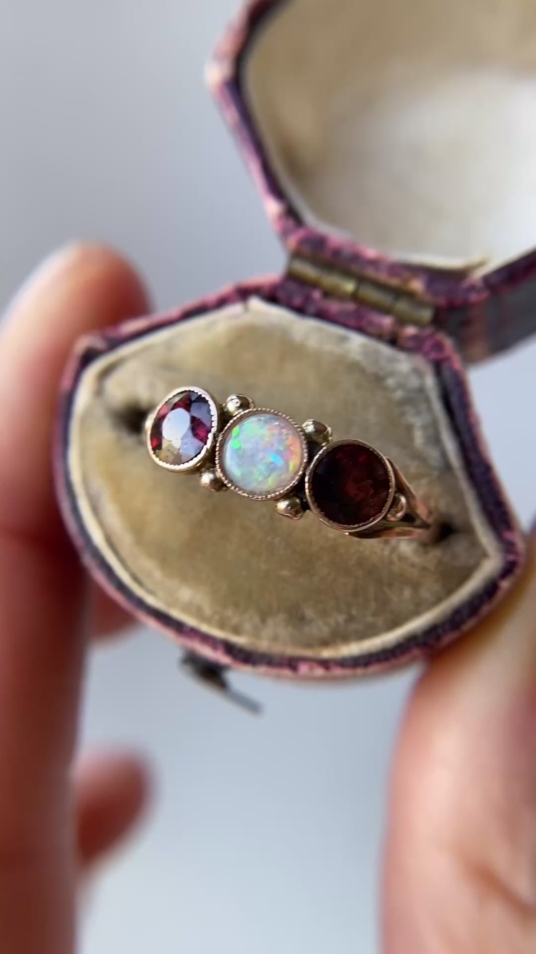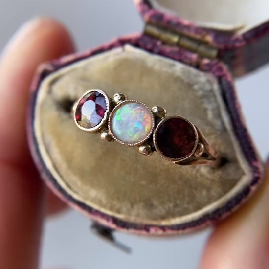 A beautiful three stone ring - almost antique, dating to 1931- and featuring a lively fiery opal, flanked by two garnets on either side.