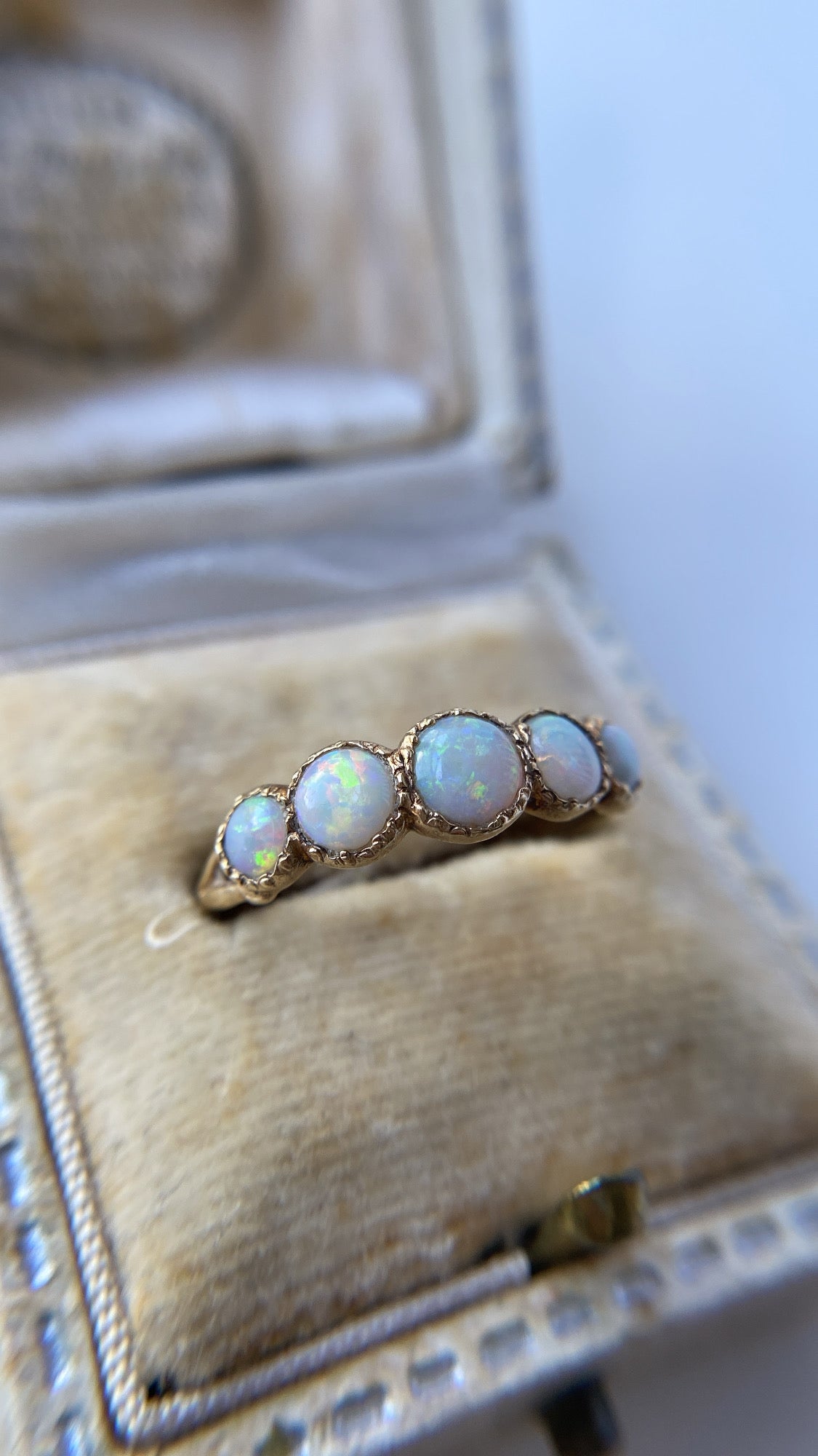 Set with five colourful round opals that show a lovely play of colours, all securely colet set in their little crimped gold settings. It measures 18.5mm wide with the centre opal measuring 4.9mm in diameter, the side ones graduating in size. Sits low on the finger, super comforting wear and stacks a dream! All stones in lovely condition, some nibbles, completely eye clean.