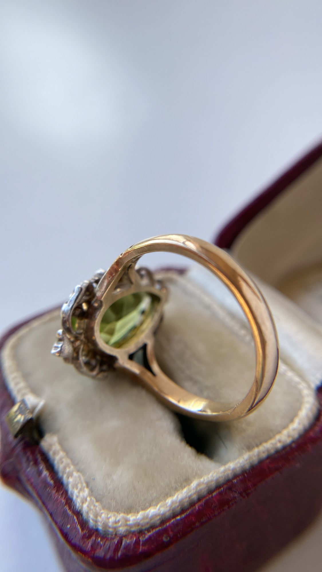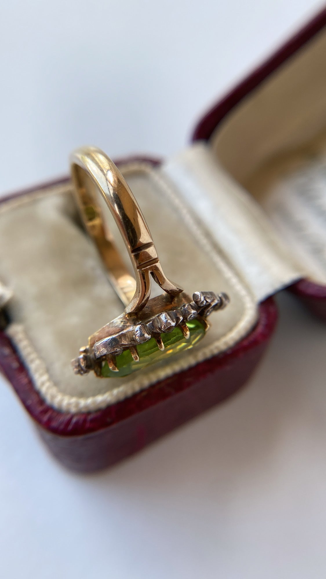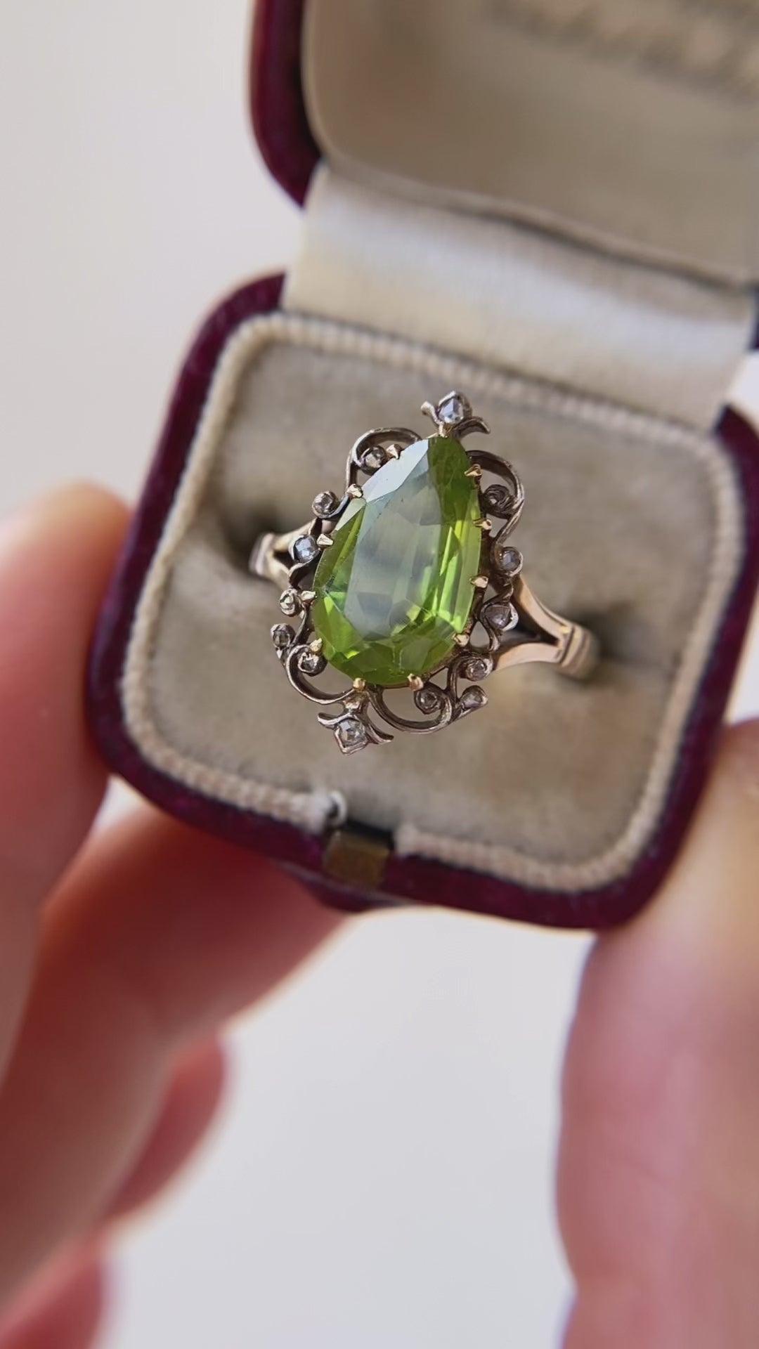 Featuring an exquisite natural pear cut peridot that is the most vibrant green, feels almost fluorescent in certain lights, a bright, strong pop of colour. Securely claw set, it is surrounded by a scattering of twelve twinkling rosecut diamonds mounted in delicate little scrolls all around the cluster. The ring face measures 16.3 x 10.4mm at its widest points, with the peridot measuring 11.8 x 6.7mm. With lovely split shoulders, the shank is sturdy and in very good condition, with minimal age related wear. Stones are all secure in their setting, no chips or abrasions to note.