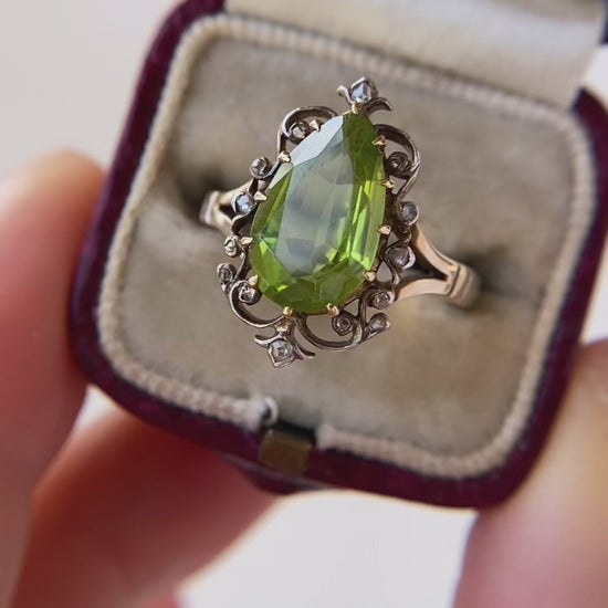 A stunning pear cut peridot ring dating from the late Victorian to early Edwardian era set in 15ct yellow gold.