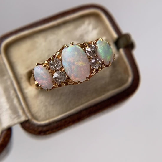 The centre opal cabochon is approx .75ct, measures 8.4 x 5.9mm and the two opals on the sides measure 5.9 x 4.5mm The four old cut diamonds twinkle beautifully, have lovely colour and clarity and weigh a total of 0.28tcw. They have lovely little puffy crowns under magnification and are extremely sparkly! The face of the ring measures 17.7mm wide. Securely claw set and just gorgeous! The shank is slightly thinning to to the back, but nothing serious to note.