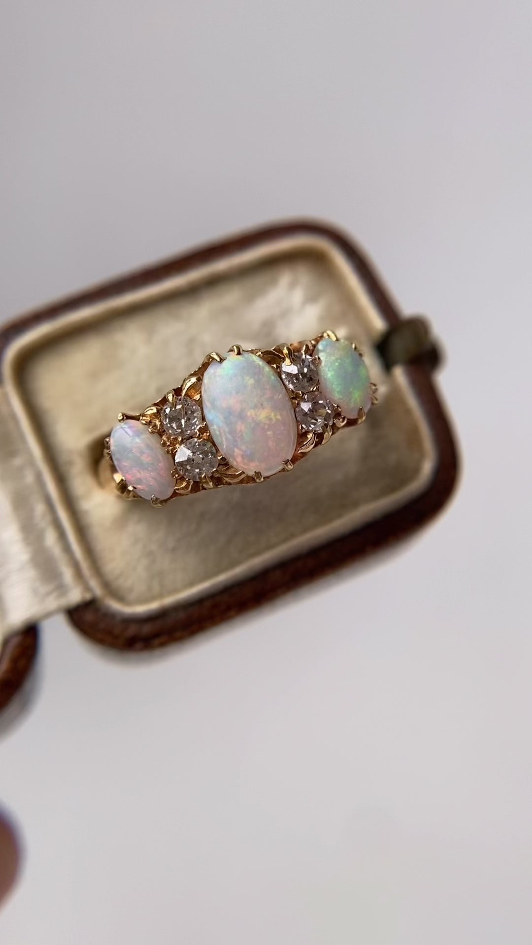 A superb antique three stone opal and old cut diamond ring, set in 18ct gold and dating from the Edwardian era.