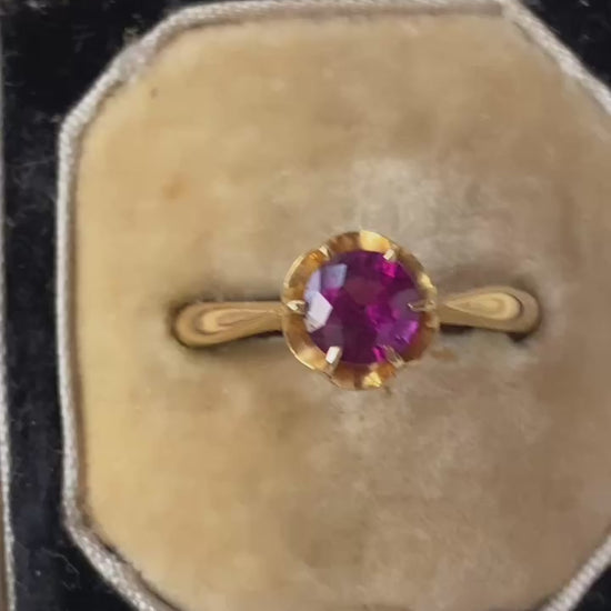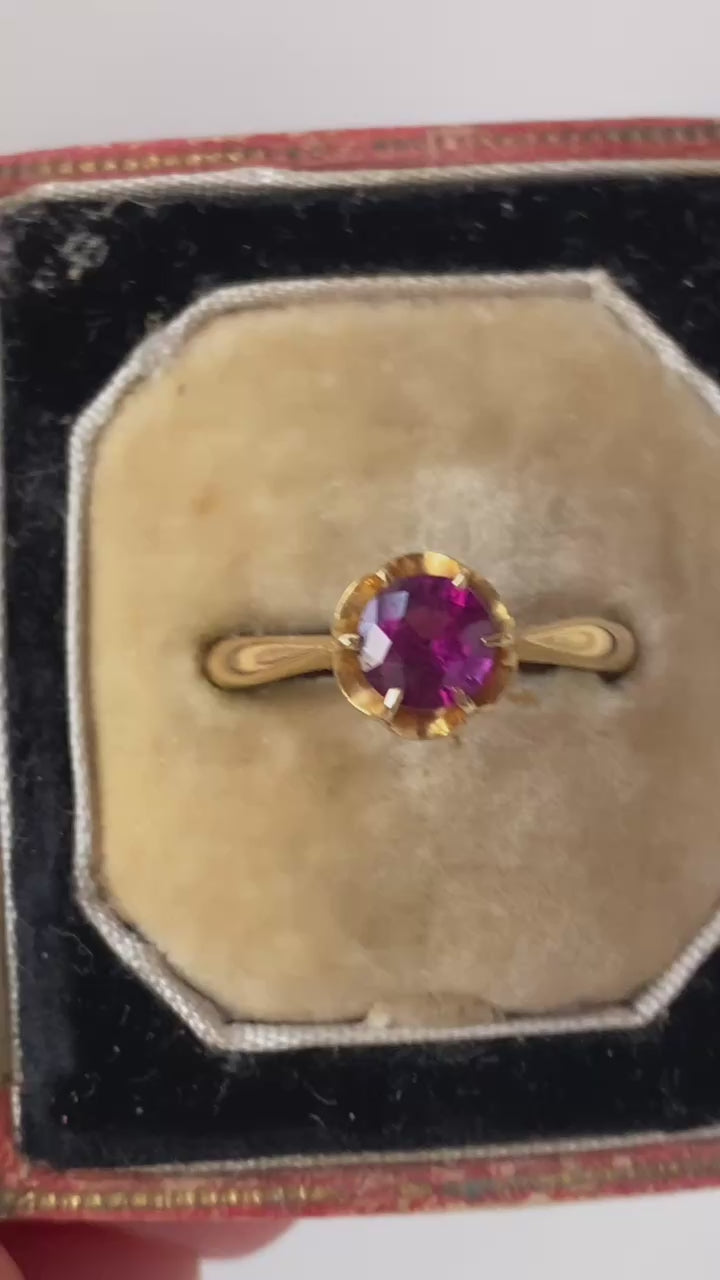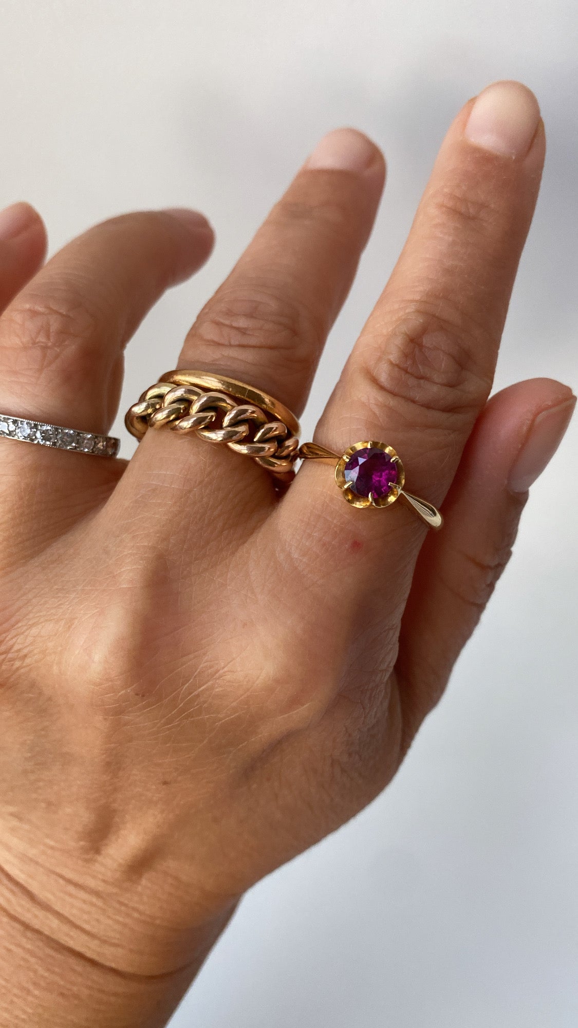 Set with a deep, saturated raspberry pink garnet, in a simple belcher setting, securely set by the carved out prongs, singling out the stone to stand out. The garnet measures 5.8mm in diameter and sits low on the finger making it perfect for stacking. Crafted in solid yellow gold, with a thick shank, it has a nice weighty feel to it. In wonderful condition and ready to wear.