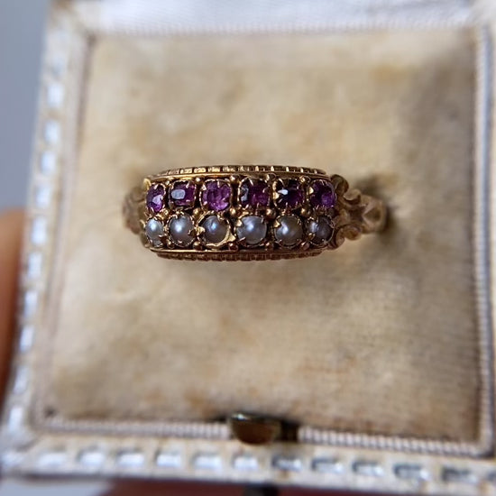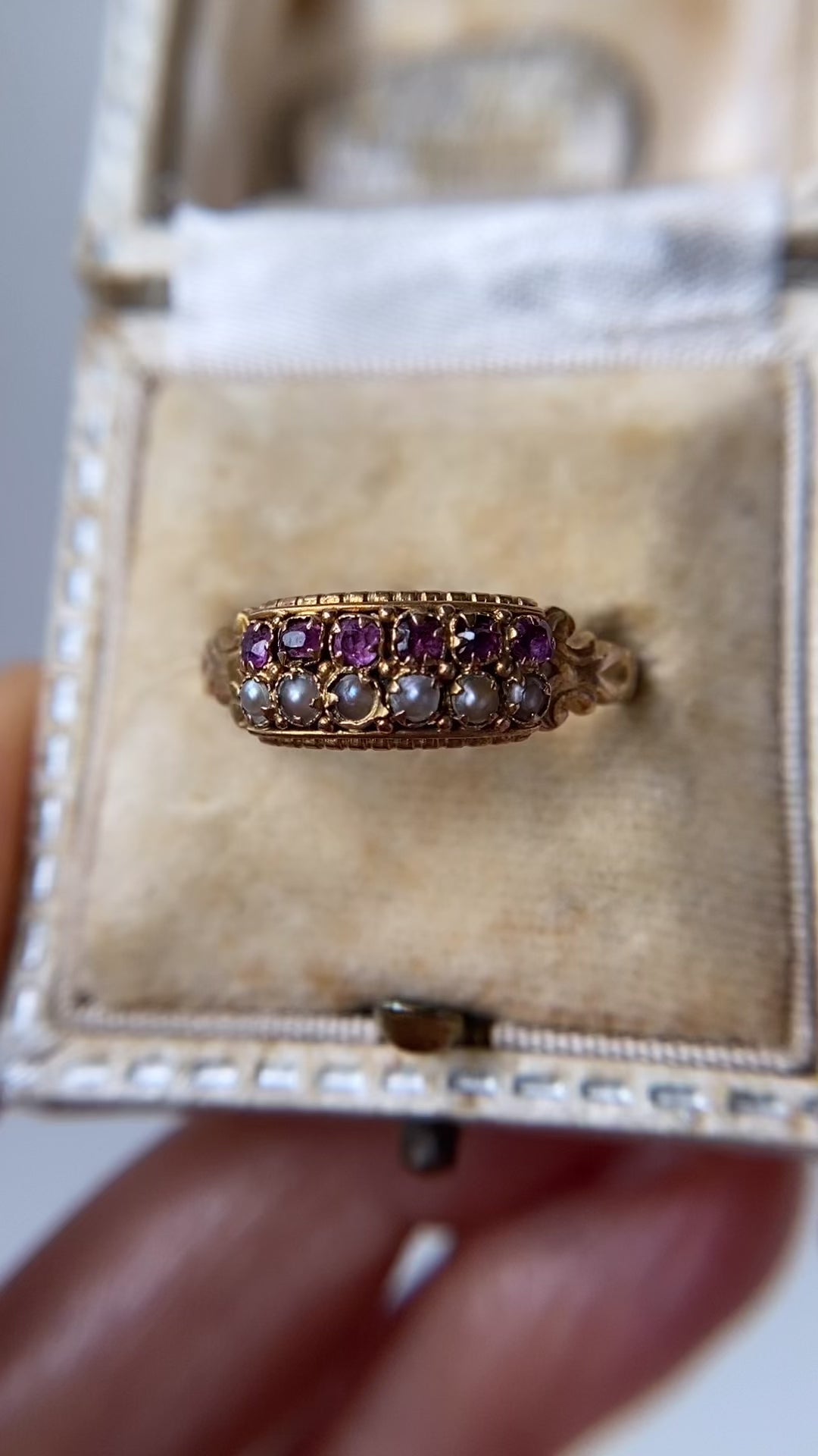 A wonderful mid Victorian ruby and split pearl ring, crafted in 15ct yellow gold.