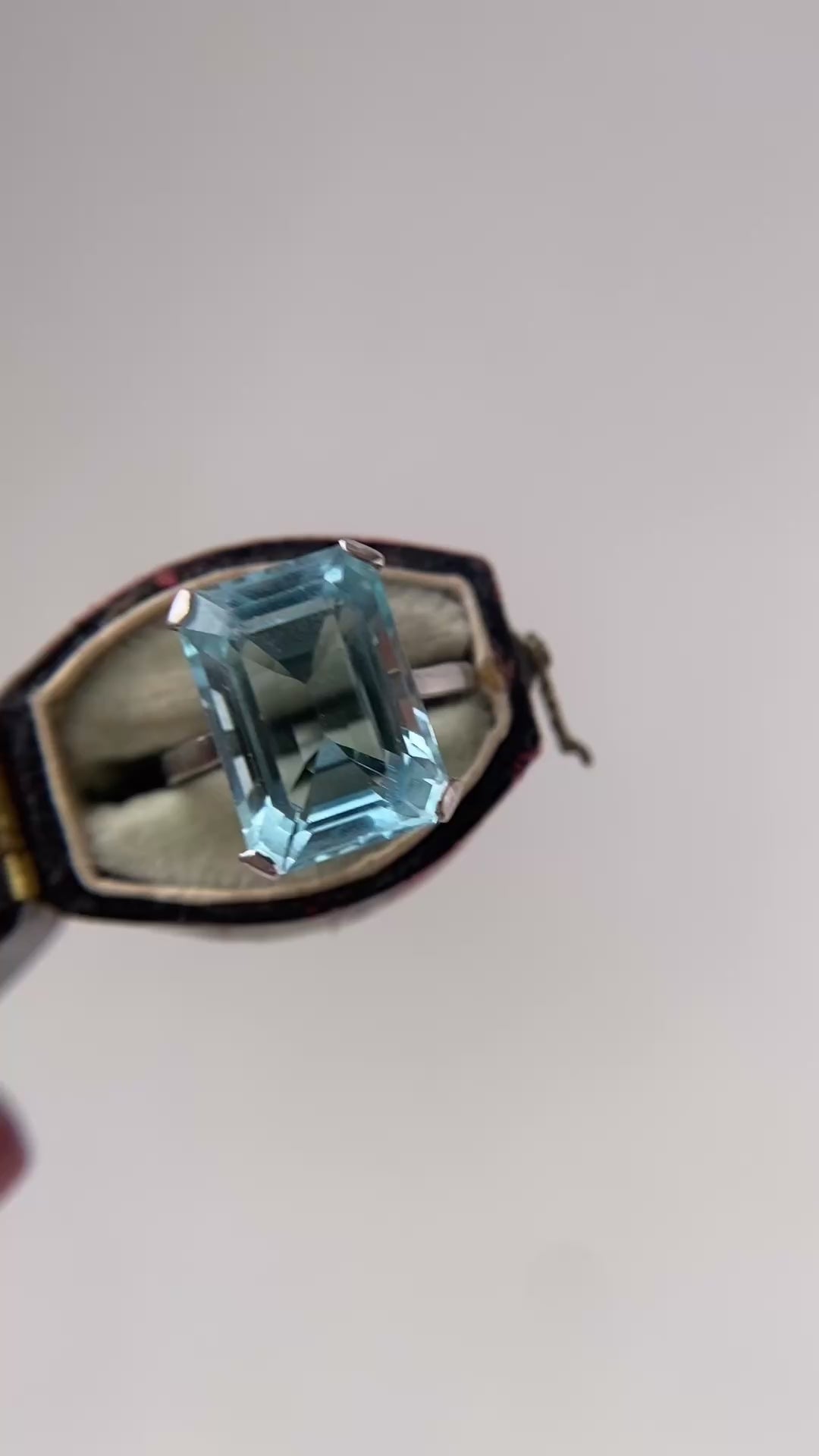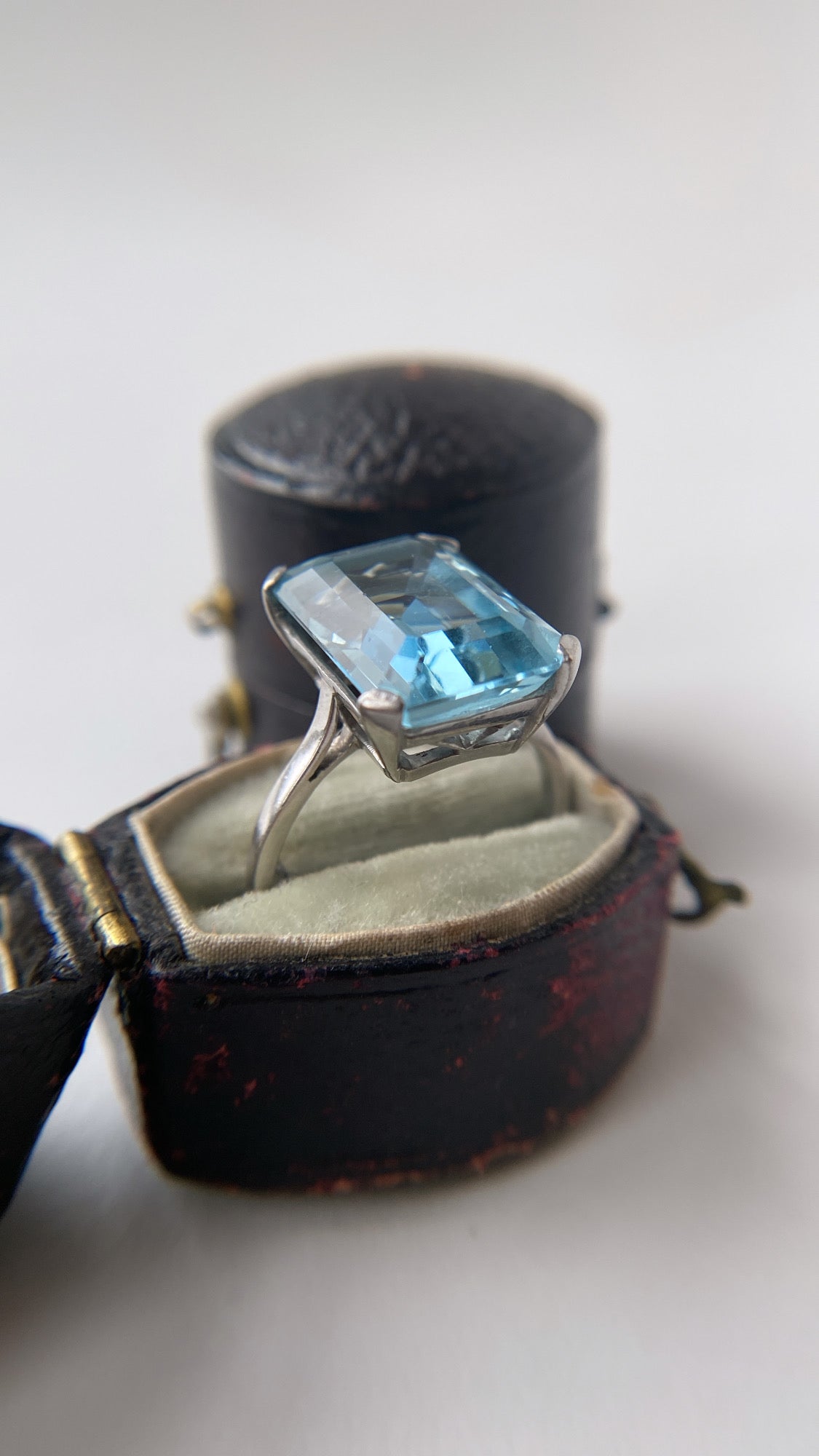 This absolutely stunning aquamarine ring is set in solid platinum and has the most incredible stone and proportions. Featuring a gorgeous natural emerald cut aquamarine, a slab of crystal clear green blue, with beautiful soft facets, it measures 14.2 x 10mm and rises 7.2mm. The stone picks up gorgeous cool green blue hues that move into a more saturated turquoise blue, depending on the light - honestly it’s wonderful! Set in solid platinum, I adore the steely grey setting with the sleek tabbed prongs on each corner. In lovely condition, nothing to note, the stone is a moving pool of water and the shape and very clean cut and setting makes this ring tres chic indeed!